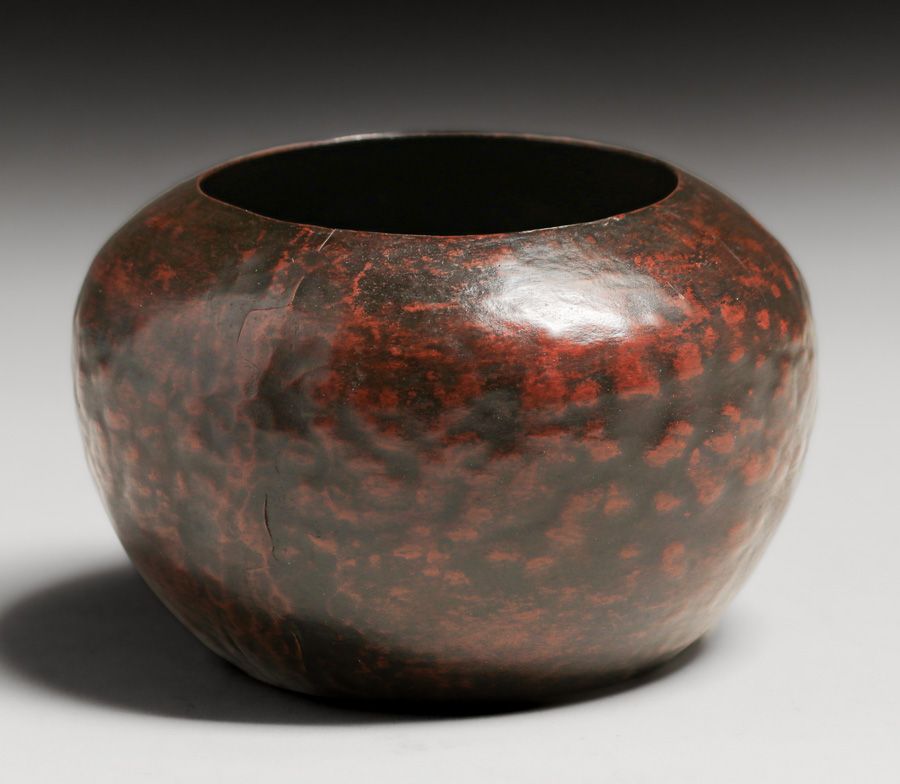 Dirk van Erp Hammered Copper Warty Vase c1913-1914. Exquisite example of van Erp’s warty with a rich dark reddish brown original patina. Signed with open-box mark. Excellent original patina. 4.75″d x 3 1/8″h SOLD