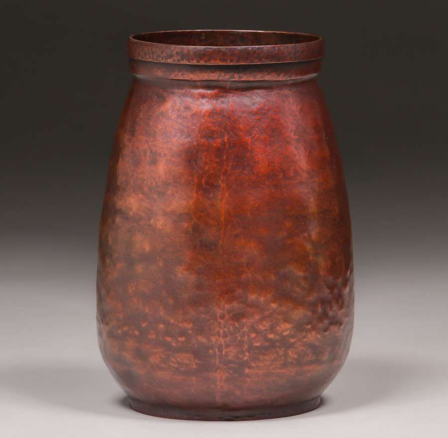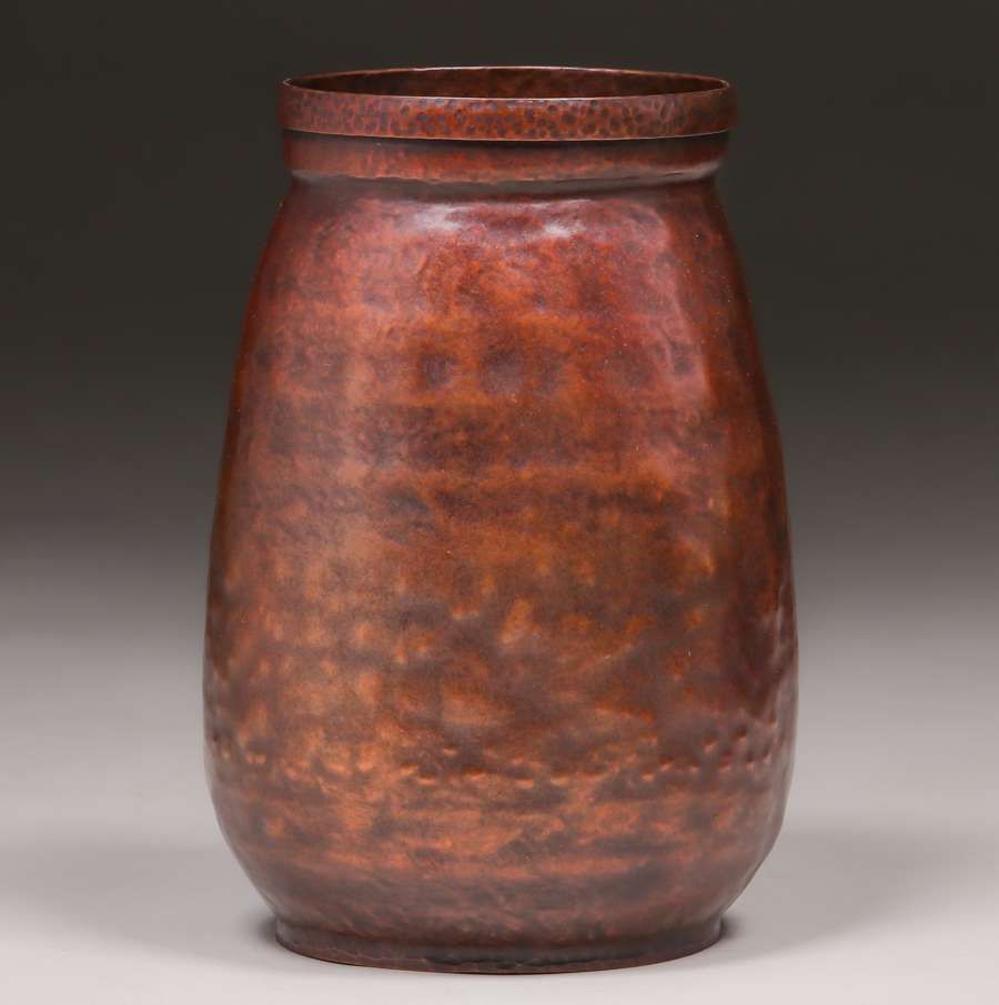 Dirk van Erp Hammered Copper Warty Vase c1920s. Signed with open-box, San Francisco mark. Excellent new patina. 10.25”h x 6”w SOLD