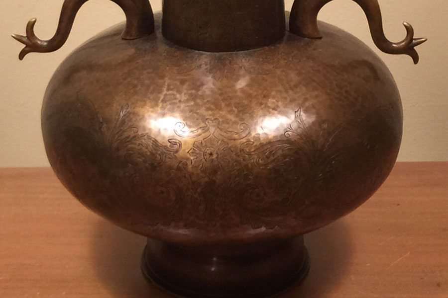Early Dirk van Erp hammered shell casing vase with unusual snake-shape curved handles and intricate design chased on base. Marked "WNY 6-1901". 13.5"h SOLD