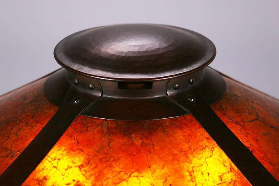 Dirk van Erp Milkcan-shaped hammered copper lamp base c1920s with a contemporary Luke Marshall hammered copper & mica shade. Base has its original finish. Signed with open-box, San Francisco mark. 25"h x 24"d SOLD