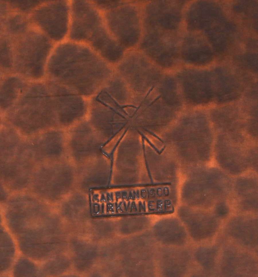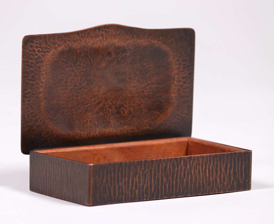 Dirk van Erp hammered copper box with beautiful radial hammering c1915-1920. Signed with open-box, San Francisco mark. Excellent new patina. 6.5"w x 4"d x 1.5"h SOLD