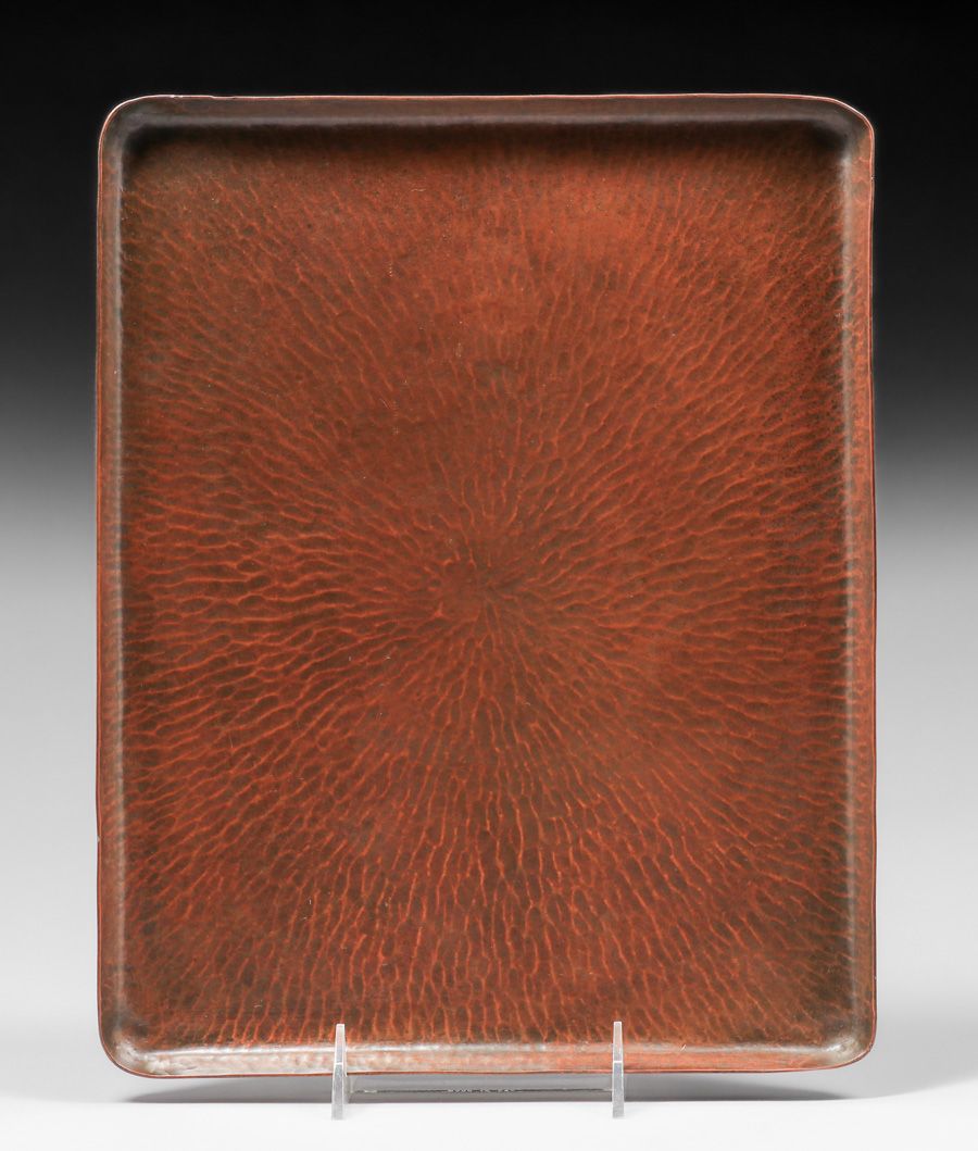 Dirk van Erp Radial Hammered Copper Rectangular Tray c1911-1912. Signed with early closed-box mark. Excellent new patina. 13 1/8" x 10 3/8" SOLD