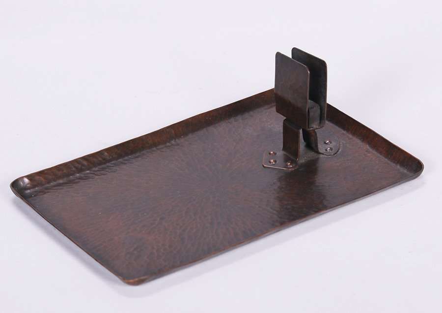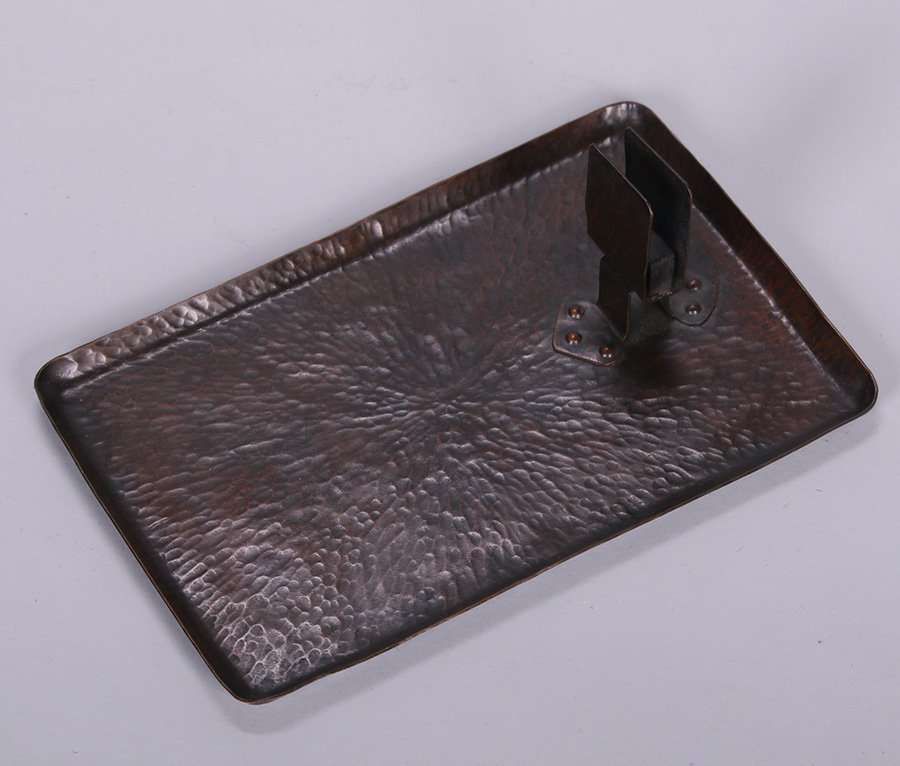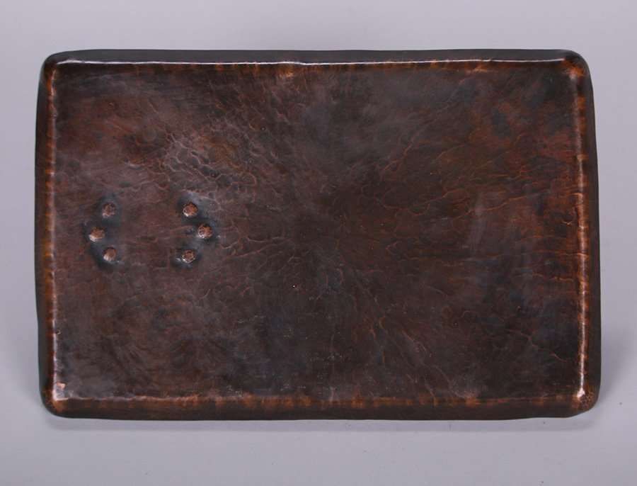 Dirk van Erp radial hammered copper smoker's tray. Unsigned. New patina. 10" x 6.5"w. Exhibited Dirk van Erp 2014 page 37 Fig 48. SOLD