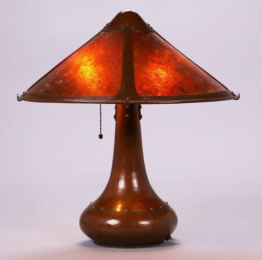 Classic Dirk van Erp hammered copper & mica two-socket rivet base lamp. Signed with open-box mark c1913-1914. Original patina with color added. Original mica. 20"h x 18.5"d SOLD