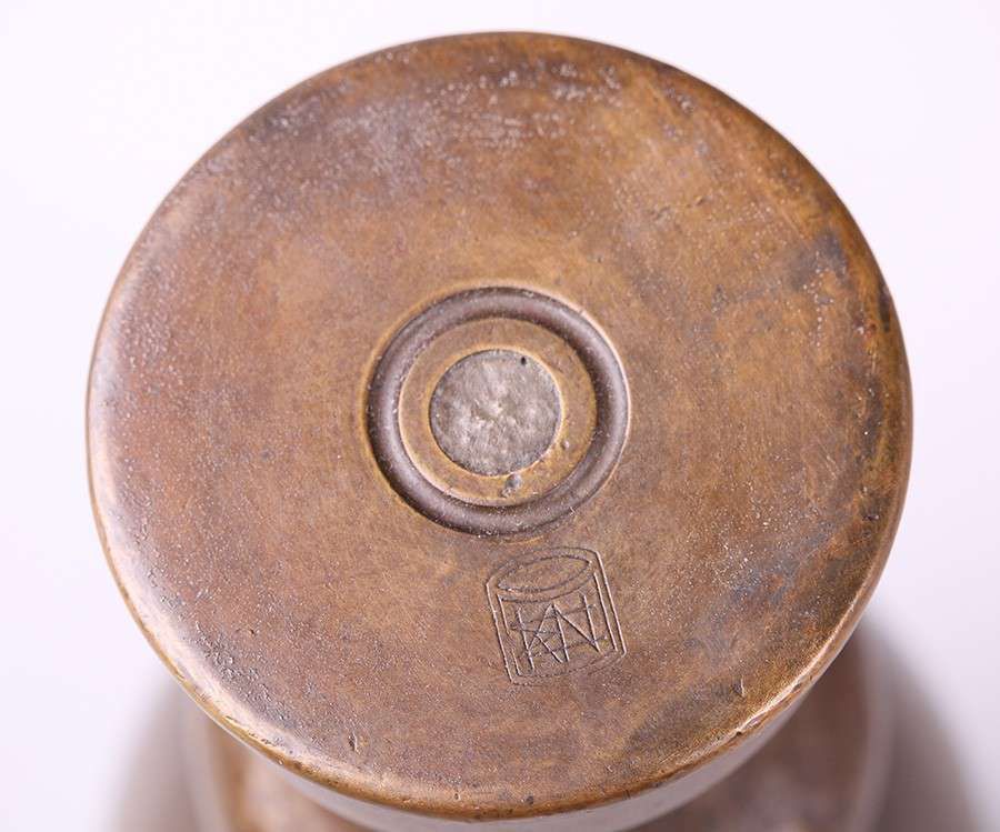 Two Dirk van Erp Shell Casings: Tall 9.75" Vase, new patina, non-standard marking SOLD ; Small 4" Flared Vase, new patina, marked "UMC Co 12-98" SOLD