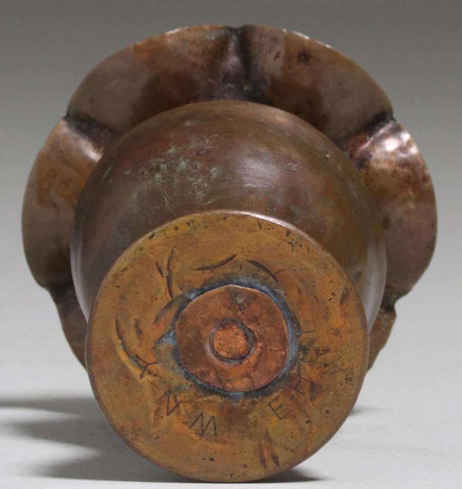 Early Dirk van Erp Hammered Brass Flared Shell Casing Vase c1902-1908. WNY mark. Excellent original patina. 3.75"h x 2.75"d SOLD
