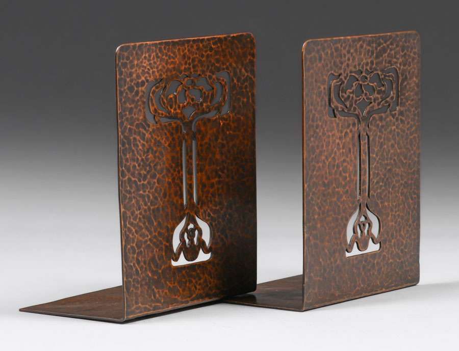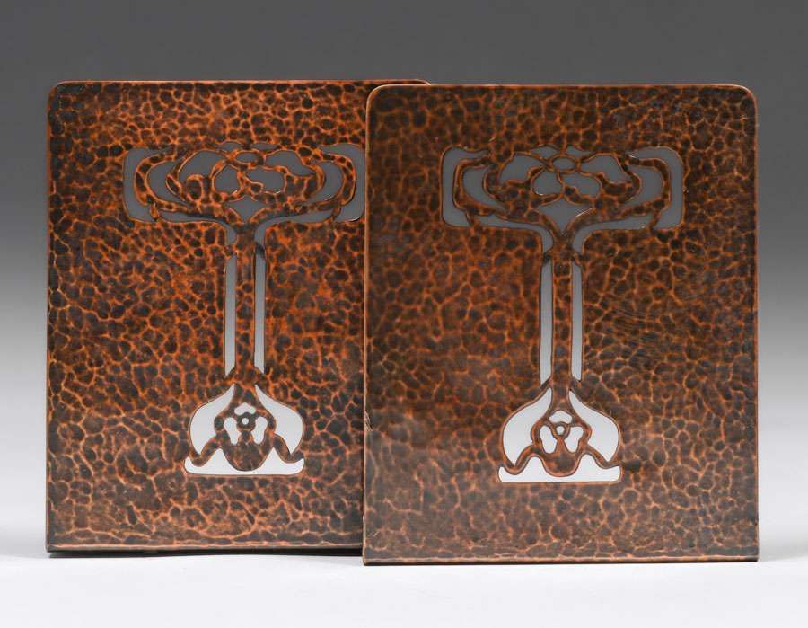 - Early Dirk van Erp Hammered Copper Cutout Bookends c1909