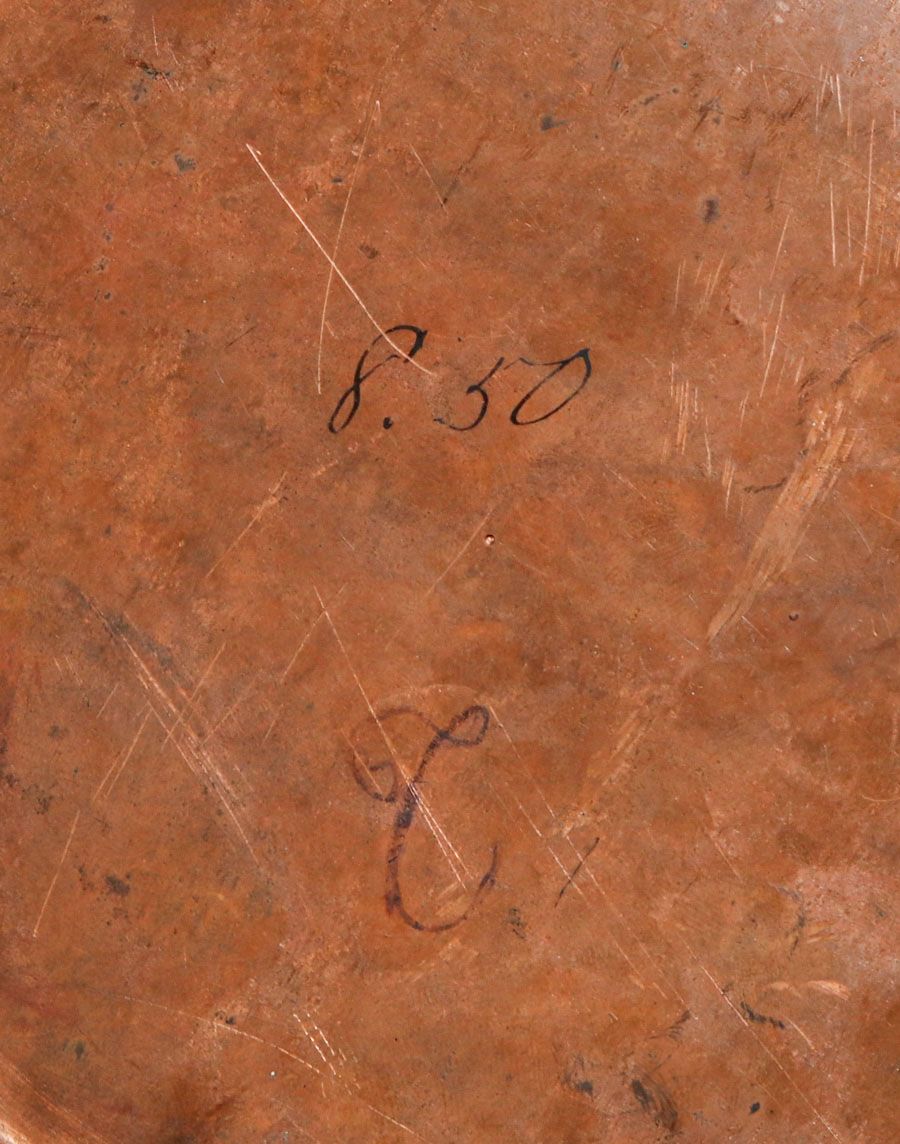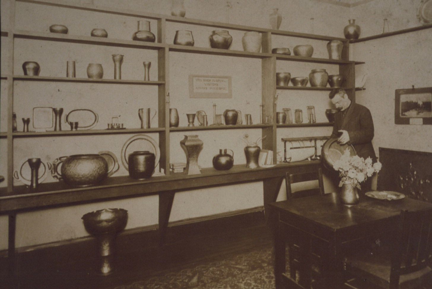 Early Dirk van Erp Hammered Copper & Mica Milkcan Lamp c1908-1909. Very cool straps across top of shade connect. D'Arcy Gaw changed this design by insisting the straps stop with a nice design element and not connect. This lamp shows van Erp's innate talent without the design sophistication of D'Arcy Gaw. Original grease pencil price on bottom $8.50. A nearly identical lamp base is pictured in front of Dirk van Erp in this November 1909 photo inside D'Arcy Gaw new studio. Excellent original patina and original mica. 21.5"h x 19"d SOLD