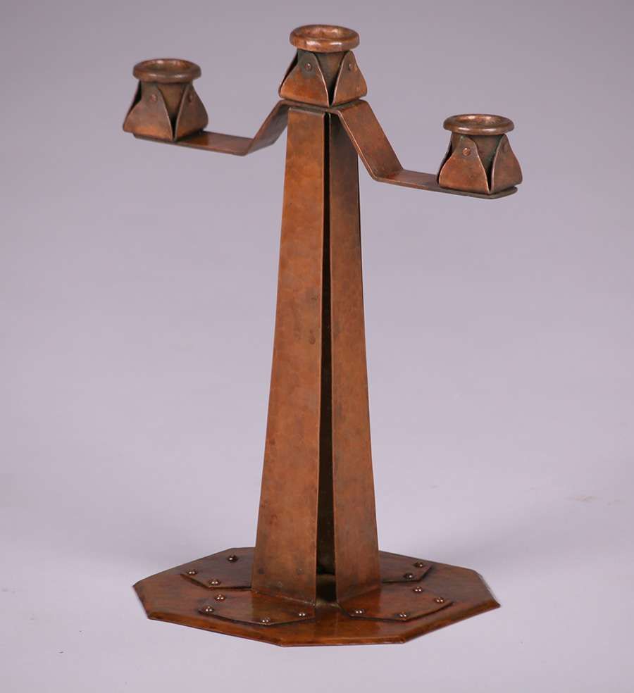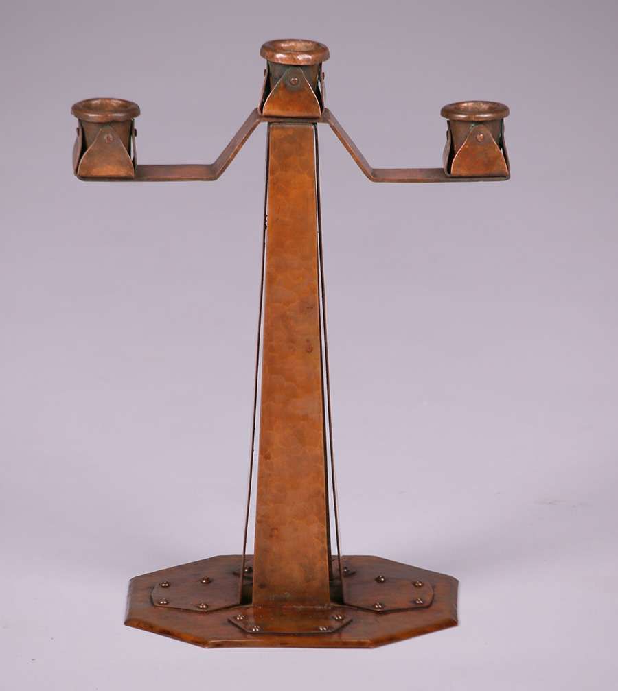 - Early Dirk van Erp Hammered Copper Triple Strap-Form Candelabra c1911-1912