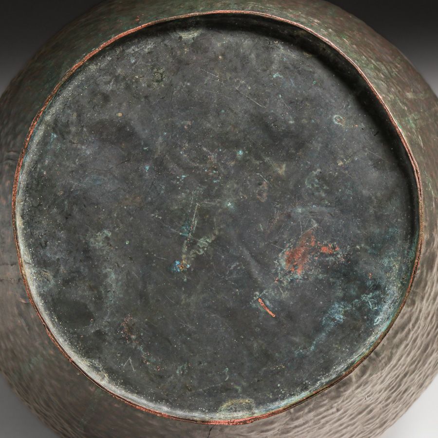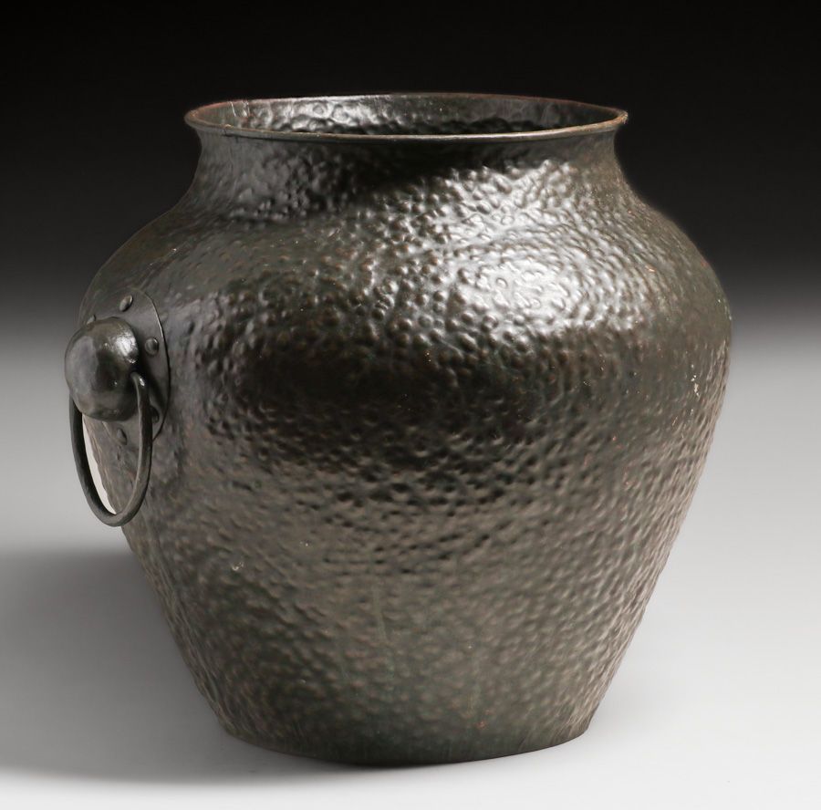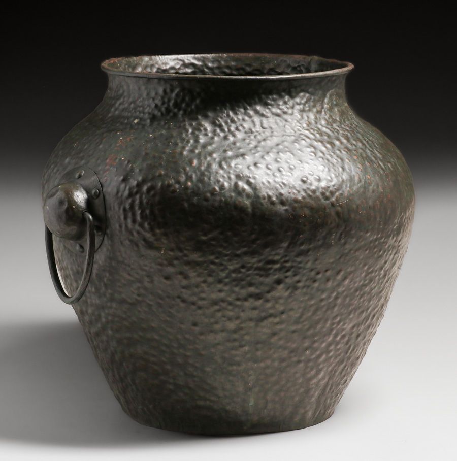 Early Dirk van Erp Hammered Copper Warty Two-Handled Vase c1908-1909. Likely made by Harry Dixon while working for Dirk van Erp in the Oakland Shop. Unsigned. Excellent original patina. 18.5"d x 15.5"h $38,000