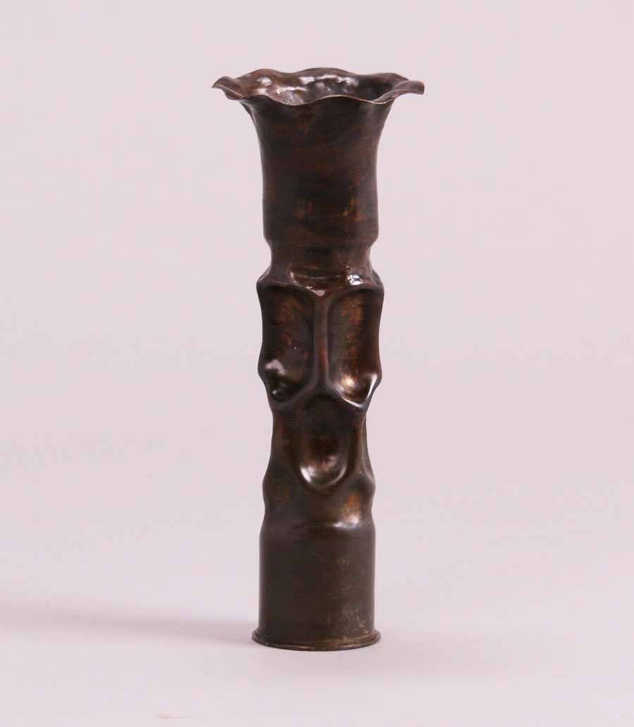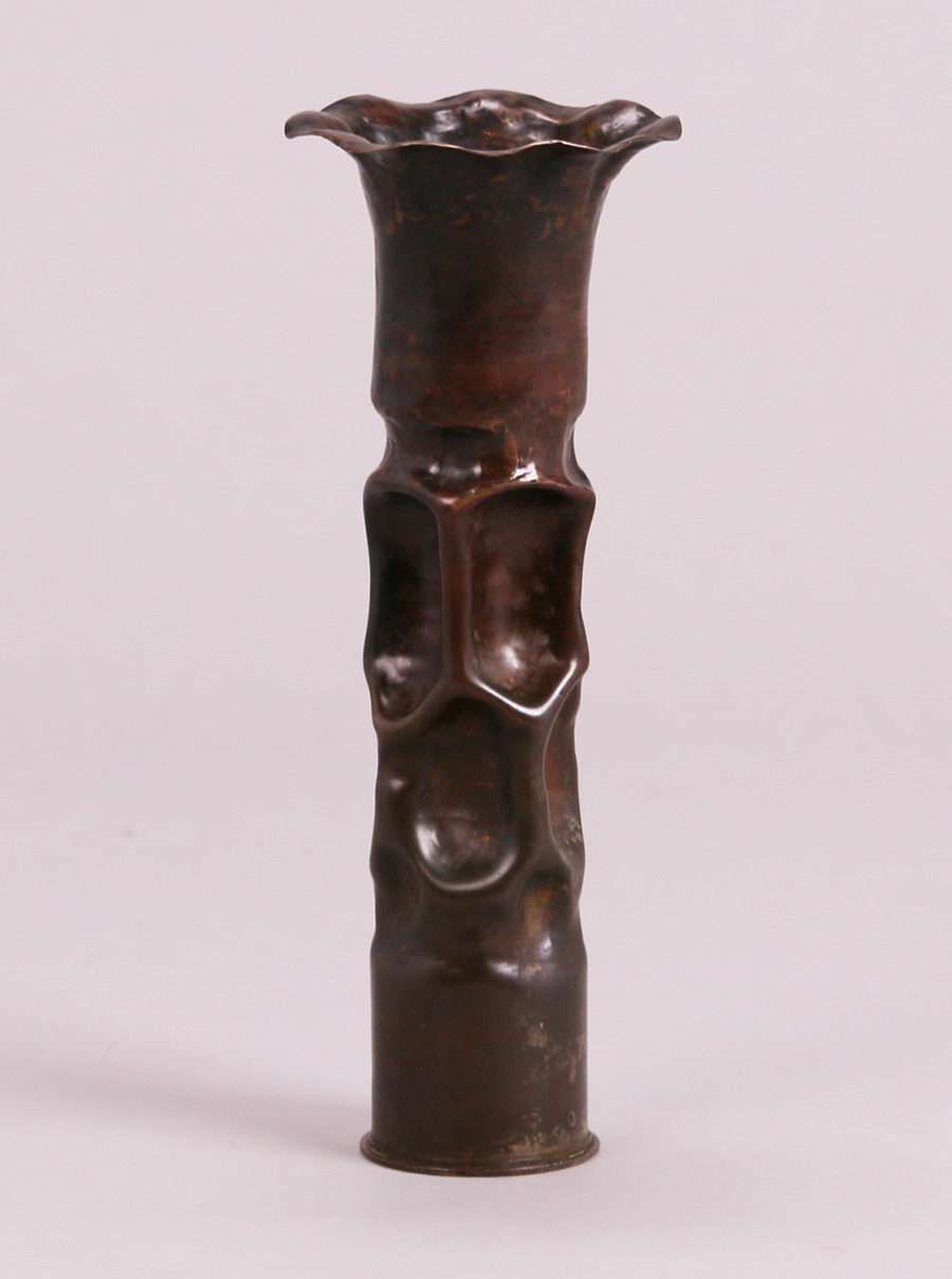 Unusual early Dirk van Erp hammered brass shell casing vase with "curtained" warty design. This type of warty design has been seen on extremely rare copper vases, but never in his earlier shell casings. Marked "WNY" and "9-1906". 11"h x 4"d SOLD