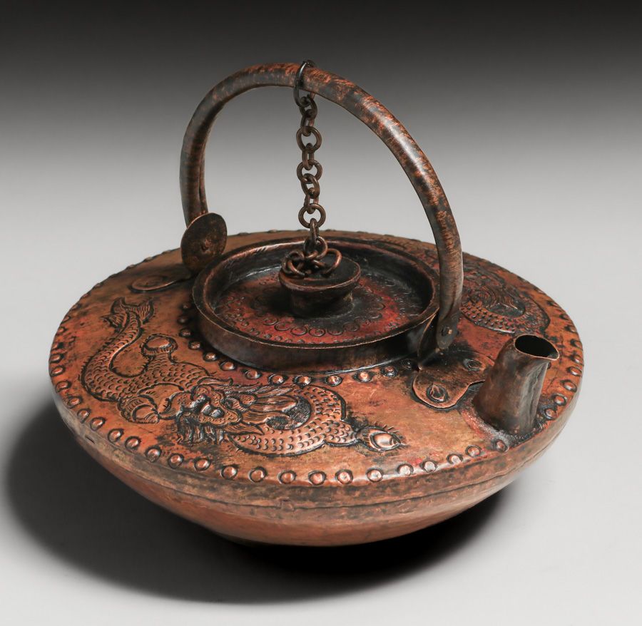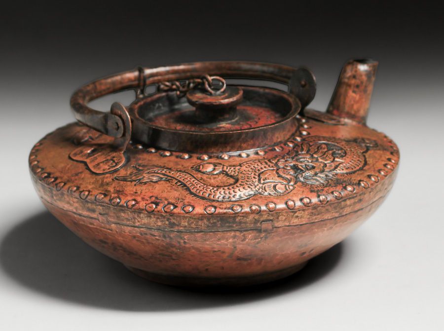 Early Dirk van Erp - Vallejo, CA Aesthetic Movement Hammered Copper Teapot c1900s. Unsigned. Excellent original patina. This is van Erp's interpretation of a Chinese Teapot. Extraordinary repousse and chase work, spotted bottom, crimped and riveted seam construction. 5"h x 6.75"d x 7.25"w SOLD