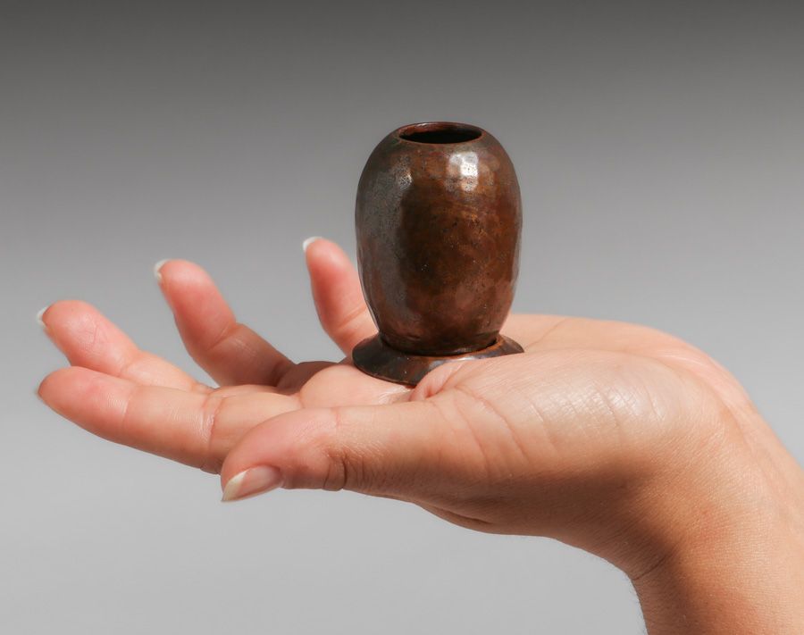 Early Miniature Dirk van Erp Hammered Copper Vase & Stand c1909. Unsigned. Excellent original patina. 2.5”h x 1.5”d SOLD