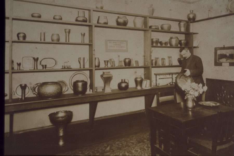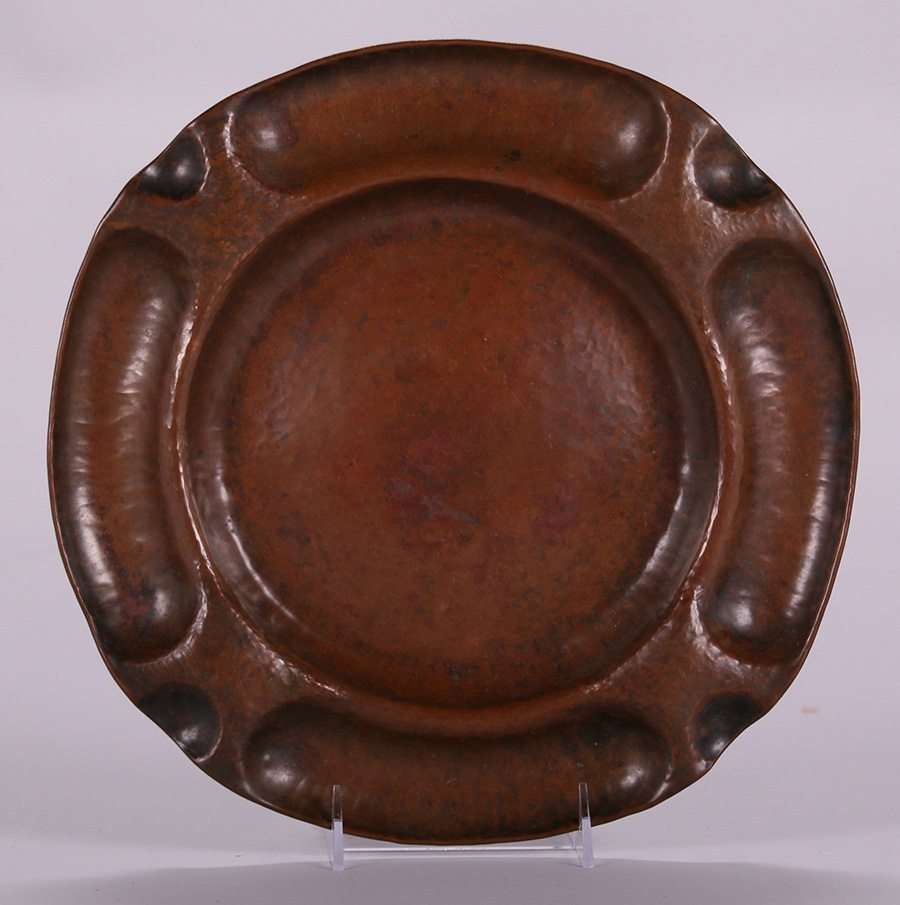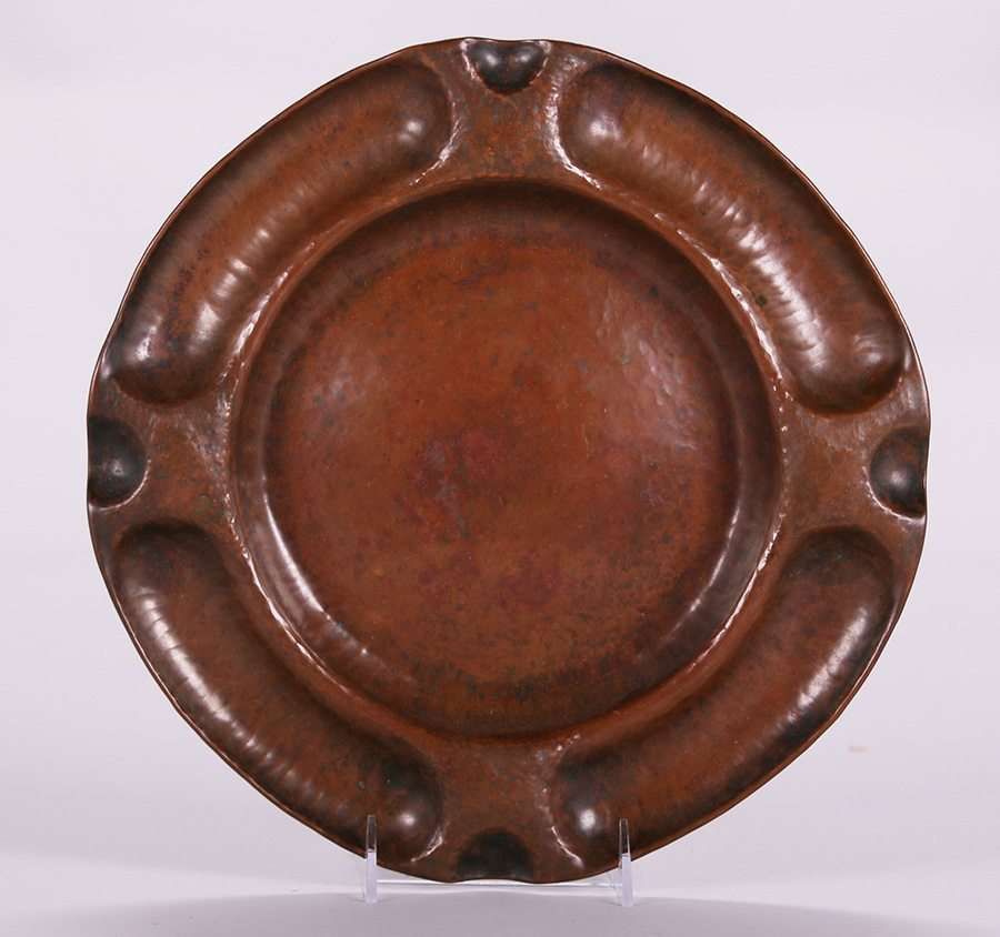 Early unsigned Dirk van Erp hammered copper wall plaque c1908-1909. Identical tray can be seen in this November 1909 photo of Dirk van Erp. Exhibited Dirk van Erp 2014. Excellent original patina. 12"d SOLD