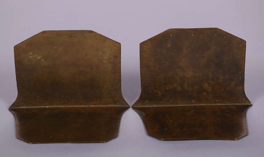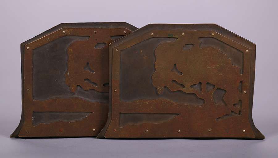 Early unsigned Dirk van Erp hammered copper and brass oak tree cutout bookends c1909. Original patina. 4 5/8″h x 6″w x 4.25″d SOLD