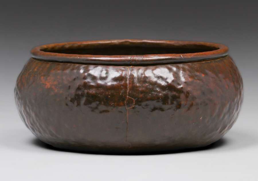 Early Unsigned Dirk van Erp “Warty” bowl c1909. Rare cramped-seam bottom. Excellent new patina. Exhibited Bay Area Copper 1900-1950, Dirk van Erp & His Influence 2012 page 14 fig 28. 10.5″d x 4.5″h SOLD