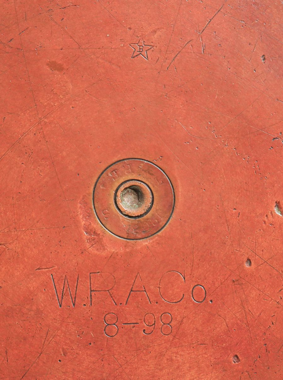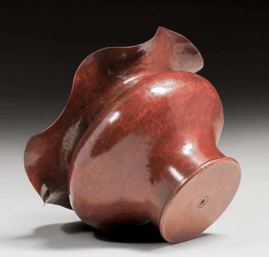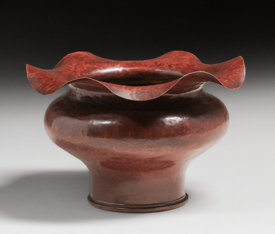 Large Dirk van Erp - Vallejo, CA Hammered Brass Shell Casing c1900-1908. Signed with Winchester Repeating Arms "W.R.A. 8-98" marking. Excellent new patina. 10"d x 6.5"h SOLD