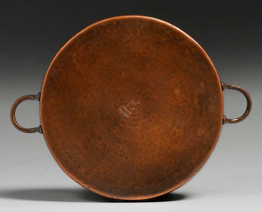 Small Dirk van Erp Hammered Copper Two-Handled Tray c1915. This is the smallest version of this tray we have ever seen. Signed. Excellent new patina. 6”d x 1.25”h SOLD