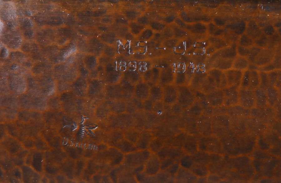 Dorothy Boyd Sailer hammered brass bowl. Sailer was a student and friend of Agatha van Erp (Hooy). Signed with impressed bumblebee mark and "D. Sailer". Excellent new patina. 16"w x 7.5"d x 3"h SOLD