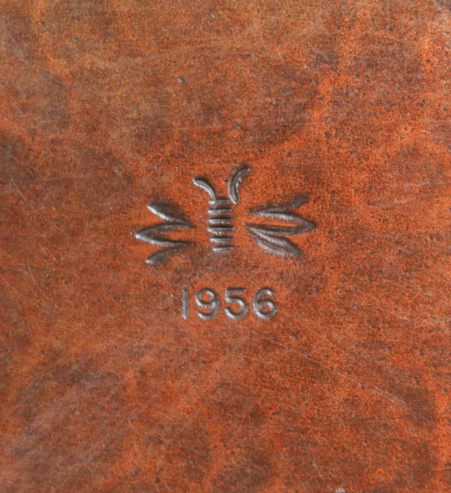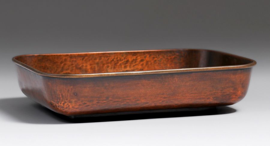 Dorothy Boyd Sailer Hammered Copper Serving Dish 1956. Sailer was a friend and student of Agatha van Erp (Hooy). Signed with impressed Bumble Bee mark. Excellent new patina. For more information see Bay Area Copper 1900-1950, Dirk van Erp & His Influence, page 45. 9.75" x 6.75" x 2.75"h SOLD