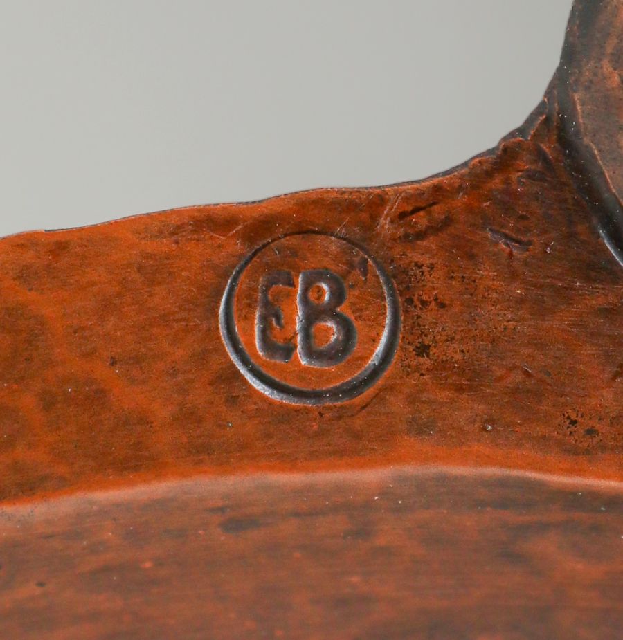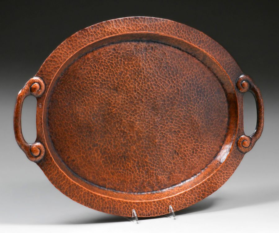 Edward Ball Hammered Copper Tray c1918-1919. Excellent new patina. Impressed "EB" mark. Excellent example of this obscure New York metalsmith. 17 3/8"w x 12 3/8" SOLD