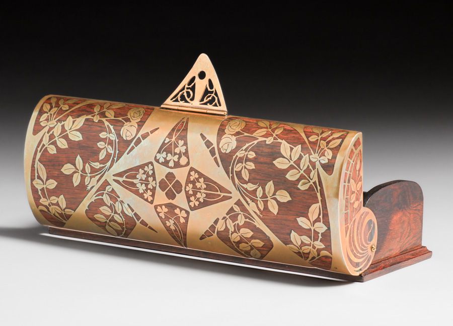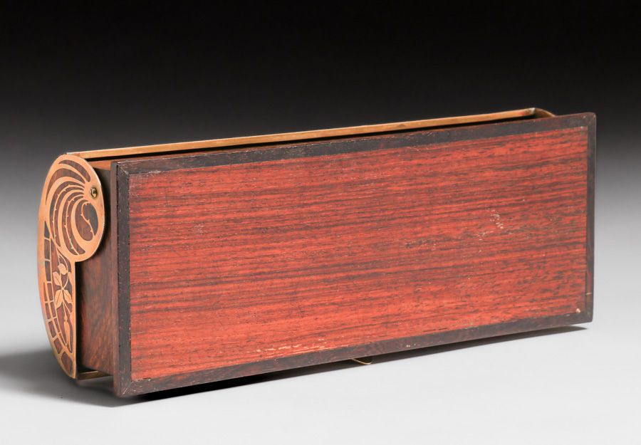 Erhard & Sohne – German Art Nouveau Secessionist Mahogany & Brass Box c1905. Unsigned. Excellent original patina. Erhard & Sohne was granted the world patent for the manufacture of brass inlay in 1904. 12.5"w x 4.75"d x 3"h SOLD