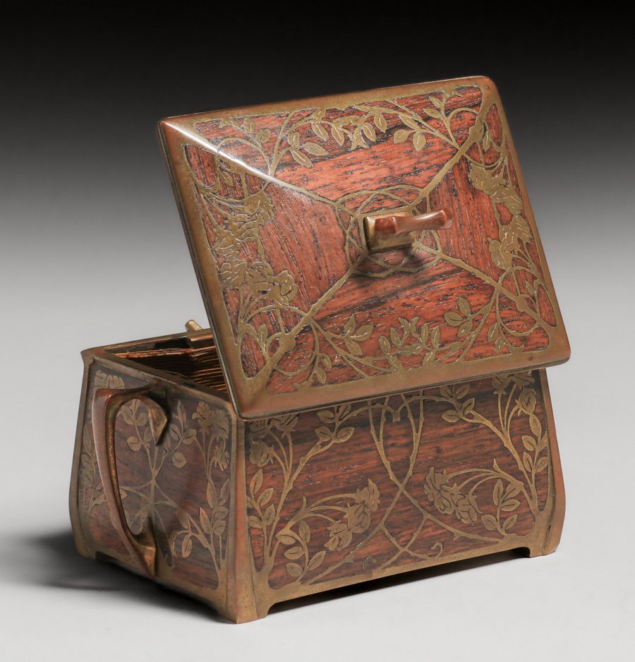Erhard & Sohne – German Art Nouveau Secessionist Mahogany & Brass Box c1905. Unsigned. Excellent original patina. Erhard & Sohne was granted the world patent for the manufacture of brass inlay in 1904. 7"w x 3.5" x 3.75"h SOLD
