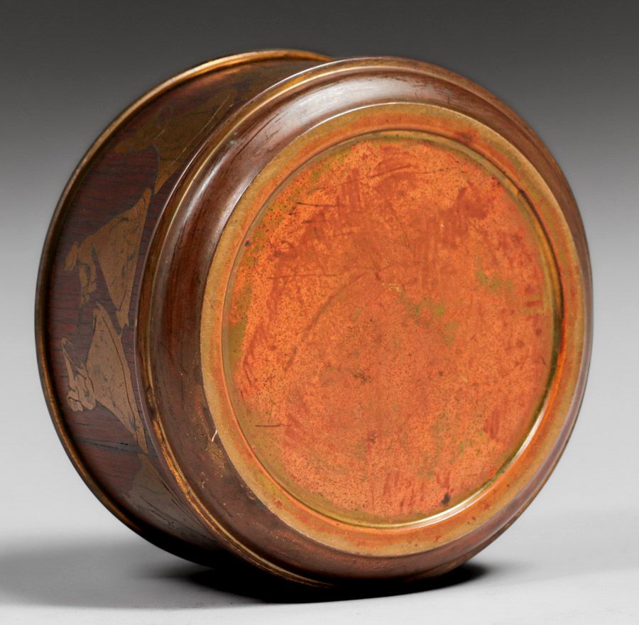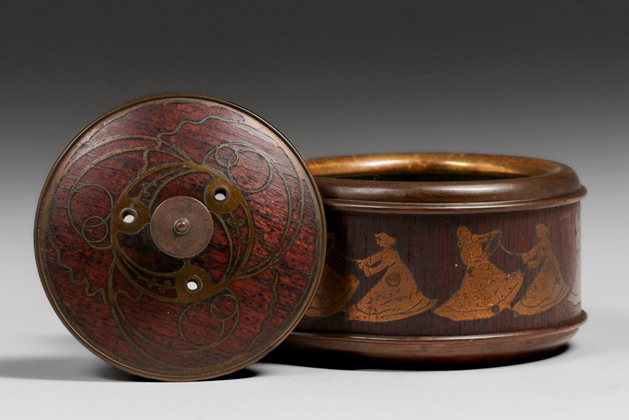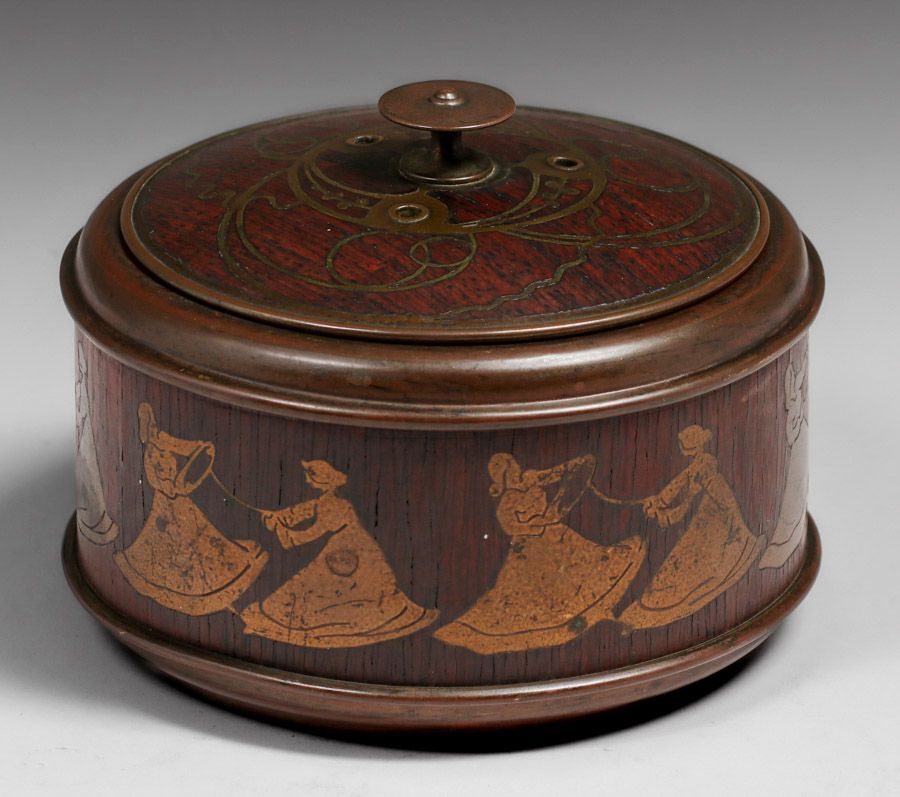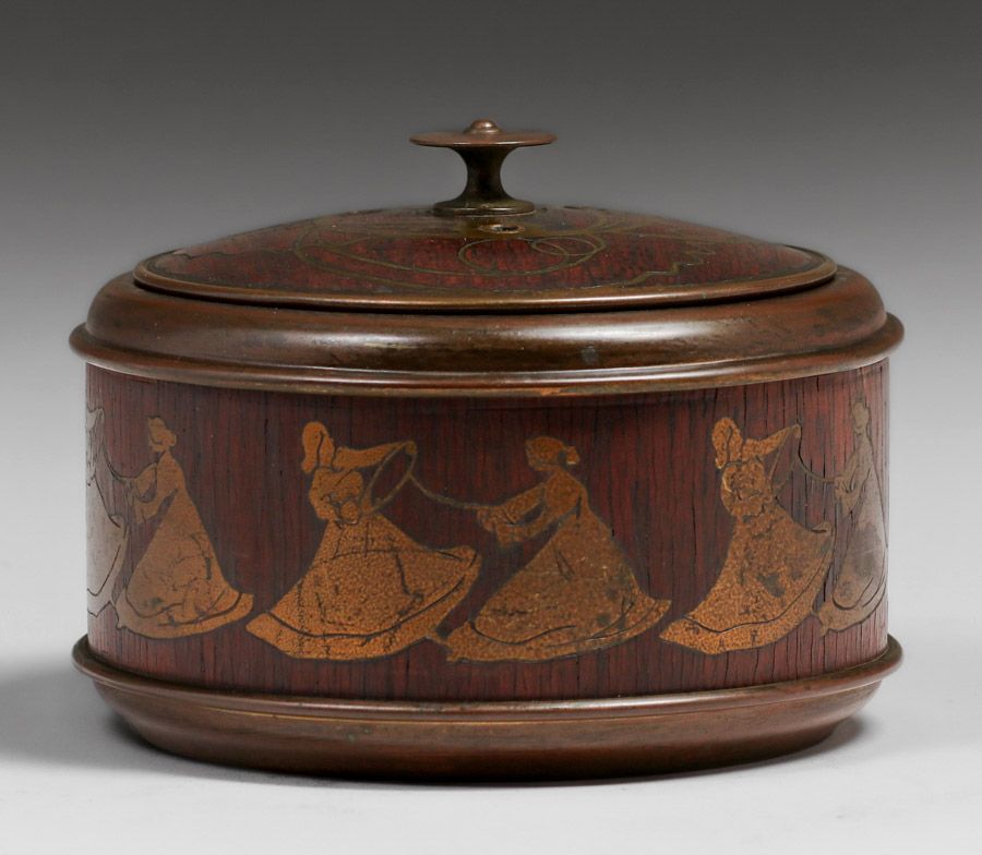 Erhard & Sohne – German Arts & Crafts Mahogany & Brass Covered Vase c1905. Unsigned. Excellent original patina. Erhard Sohne was granted the world patent for the manufacture of brass inlay in 1904. 4"h x 5.5"d SOLD