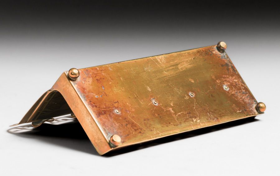 Erhard & Sohne – German Arts & Crafts Mahogany & Brass Pipe Rest c1905. Unsigned. Excellent original patina. Erhard Sohne was granted the world patent for the manufacture of brass inlay in 1904. 8 5/8"w x 4"h x 3.25"d SOLD