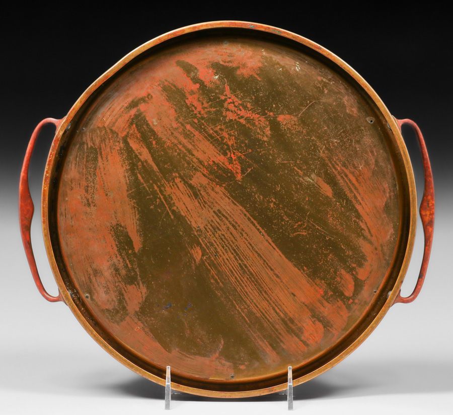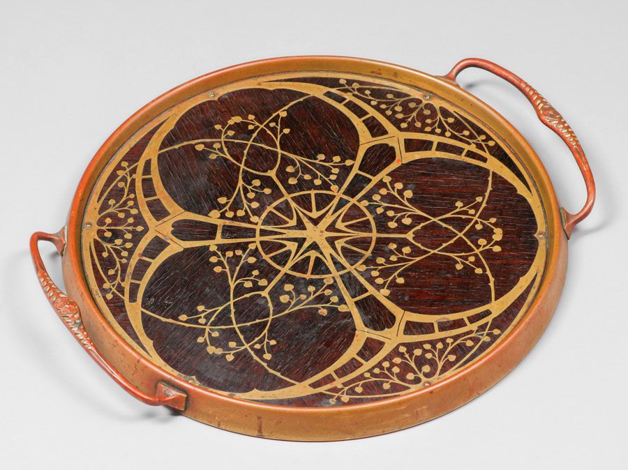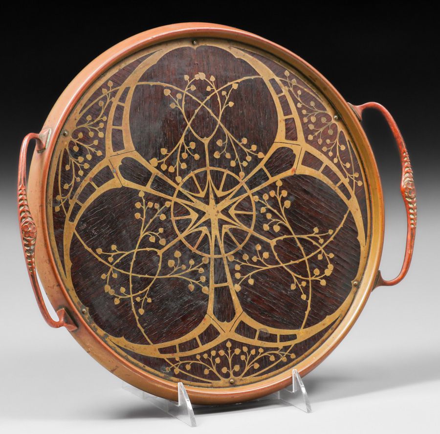 Erhard & Sohne – German Arts & Crafts Mahogany & Brass Two-Handled Tray c1905. Unsigned. Excellent original patina. Erhard Sohne was granted the world patent for the manufacture of brass inlay in 1904. 13"w x 11"d SOLD