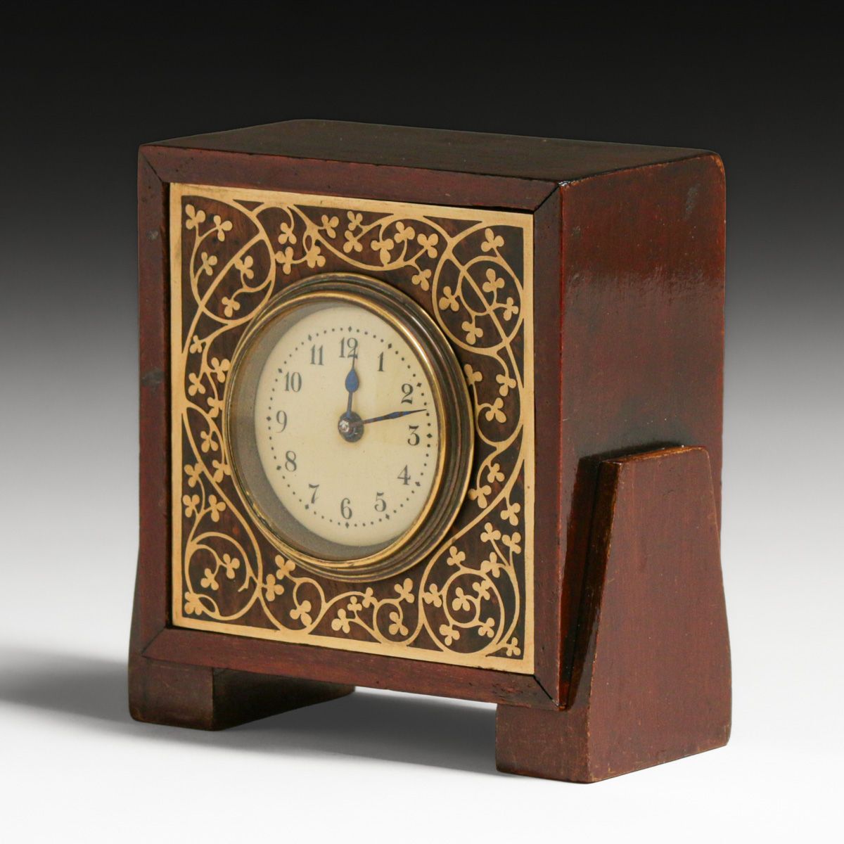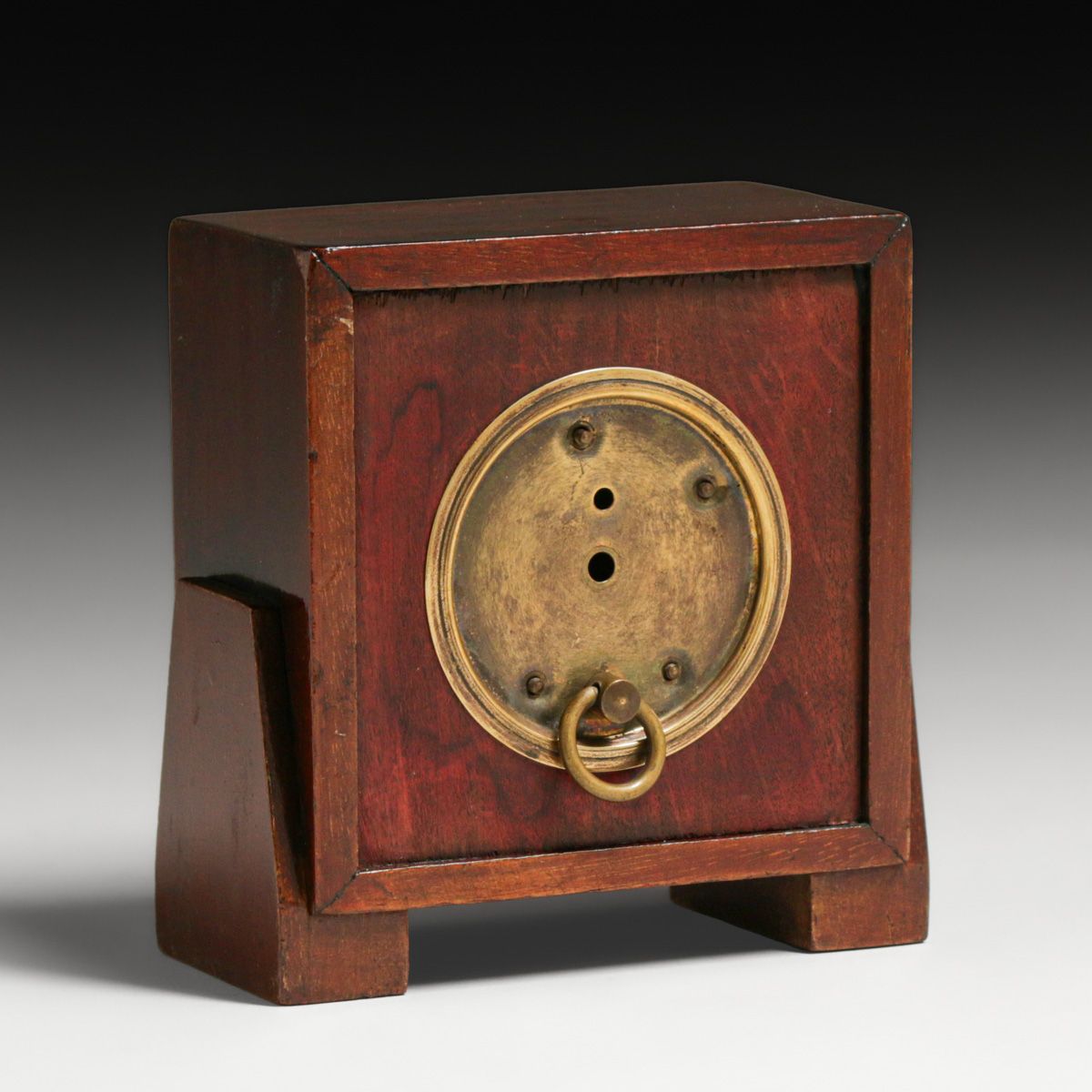 Erhard & Sohne – German Arts & Crafts Secessionist Mahogany & Brass Clock c1905. Unsigned. Excellent original patina. Erhard & Sohne was granted the world patent for the manufacture of brass inlay in 1904. 4.75" x 4.5"w x 2"d