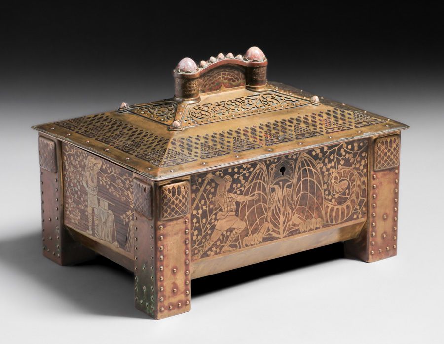 Important Erhard & Sohne – German Arts & Crafts Mahogany & Brass Jewelry Casket c1905. Agate cabochons and German folklore motifs. Unsigned. Excellent original patina. Erhard Sohne was granted the world patent for the manufacture of brass inlay in 1904. 12.25"w x 9" x 8.25"h SOLD