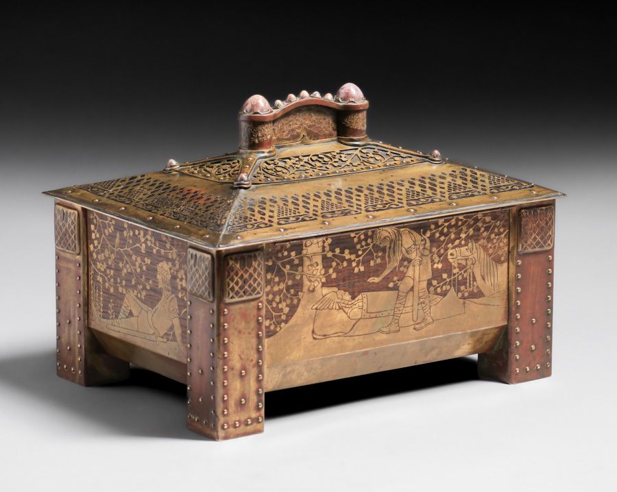 Important Erhard & Sohne – German Arts & Crafts Mahogany & Brass Jewelry Casket c1905. Agate cabochons and German folklore motifs. Unsigned. Excellent original patina. Erhard & Sohne was granted the world patent for the manufacture of brass inlay in 1904. 12.25"w x 9" x 8.25"h