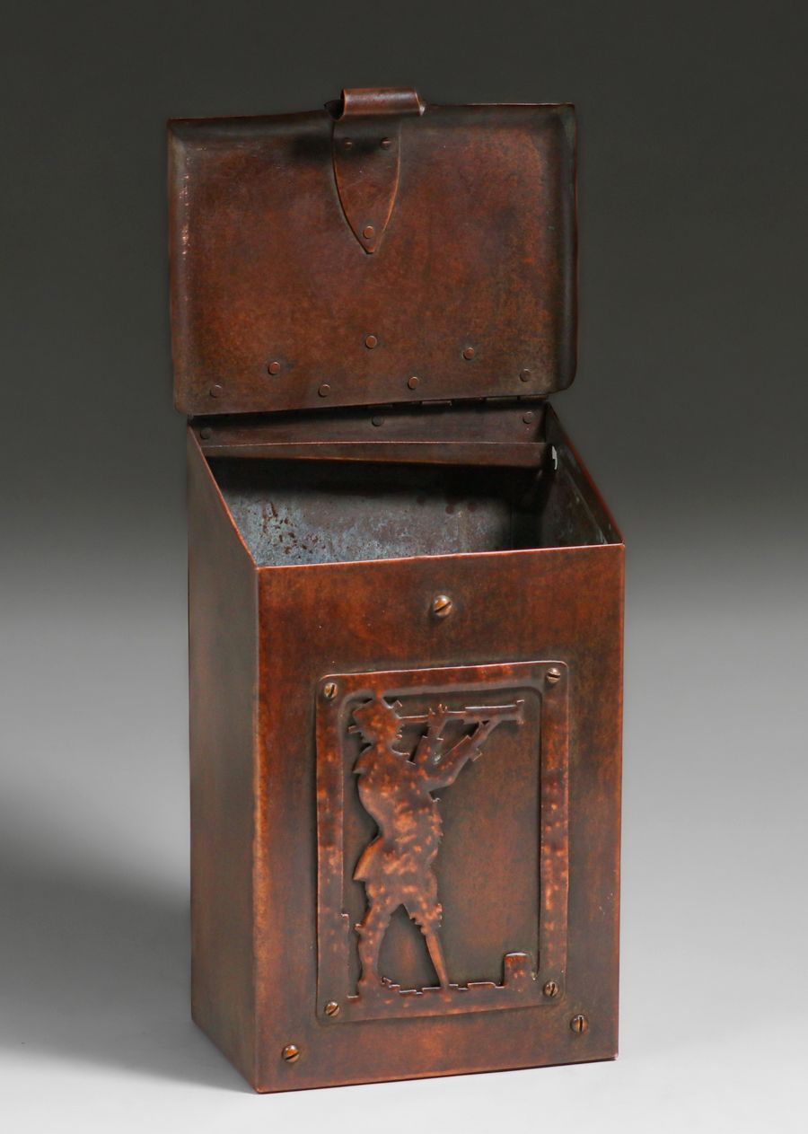 Grand Rapids Hammered Copper Cutout Mailbox c1910. Similar to Forest Craft Guild. Unsigned. Excellent new patina. 12.5"h x 6.75"w x 4.5"d $1200