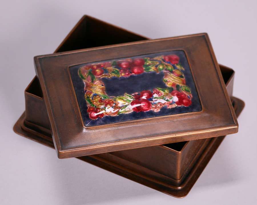 Frank Marshall (attributed) hammered copper and enamel rectangular box. Boston, MA. Unsigned. Excellent new patina. 6 5/8"w x 5 1/8" x 2.25"h SOLD