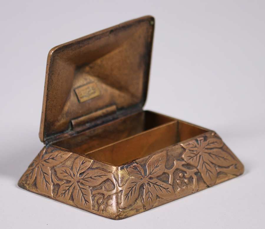 Marshall Fields Arts & Crafts stamp box c1910. Signed. Excellent original patina. 3.75"w x 2.75"d x 1.75"h SOLD