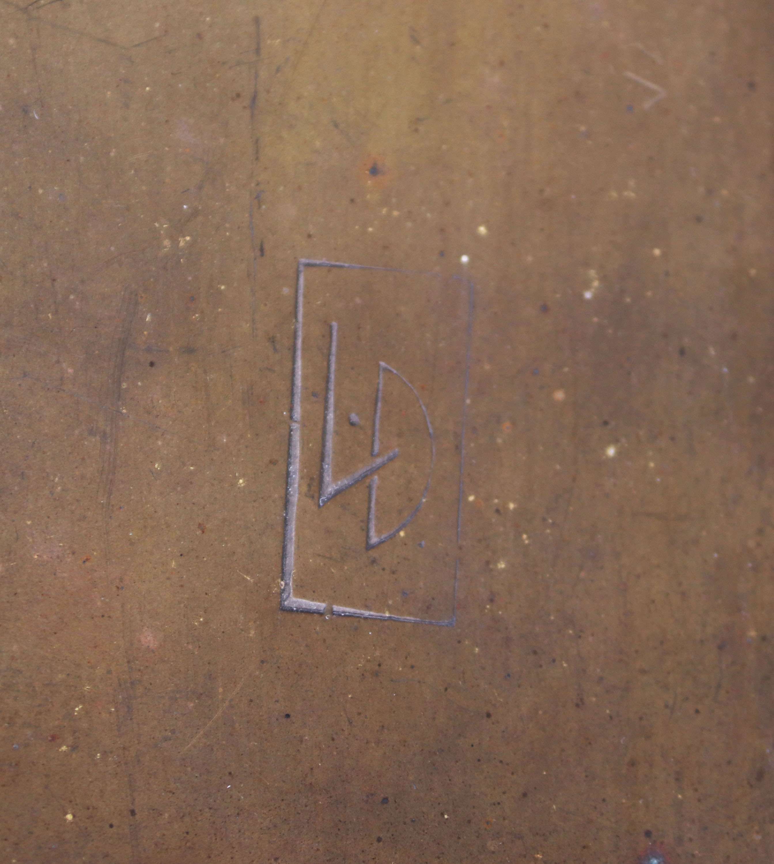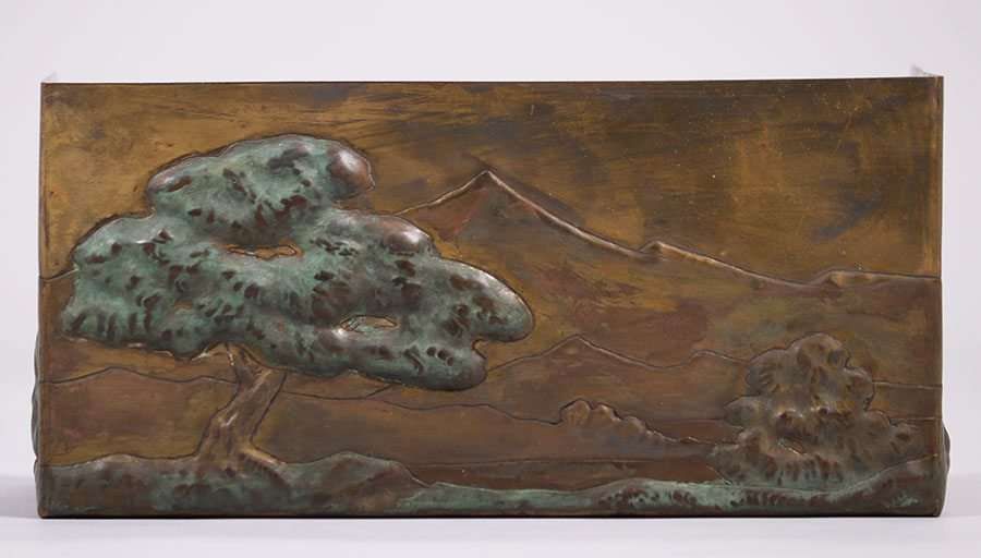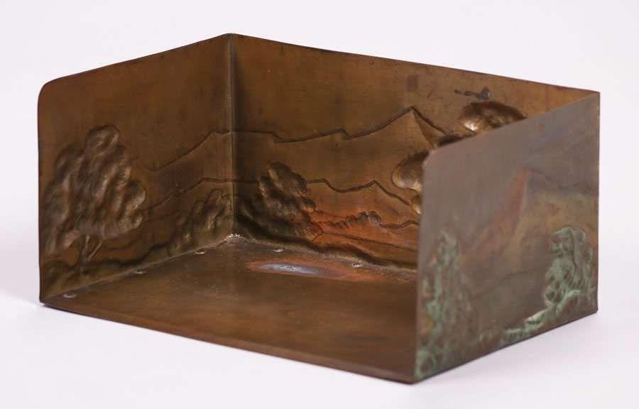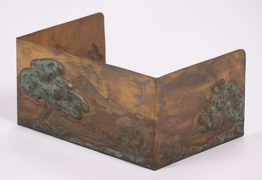 Frederick Lueders (1875-1970) hammered brass bookrack with incredibly beautiful repousse Monterey Cypress trees. Lueders was trained by and worked for Elizabeth Burton of Santa Barbara from 1902-1909. He lived and worked as a designer and metalsmith in Pasadena from 1910-1912. Lueders made the lamp in the entrance to The Gamble House in Pasadena. His works are extremely rare. Signed LD for Lueders Design. Excellent original patina. 5"h x 10.25"w x 7"d SOLD
