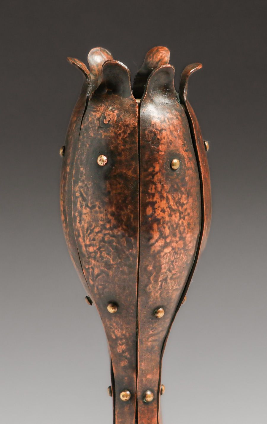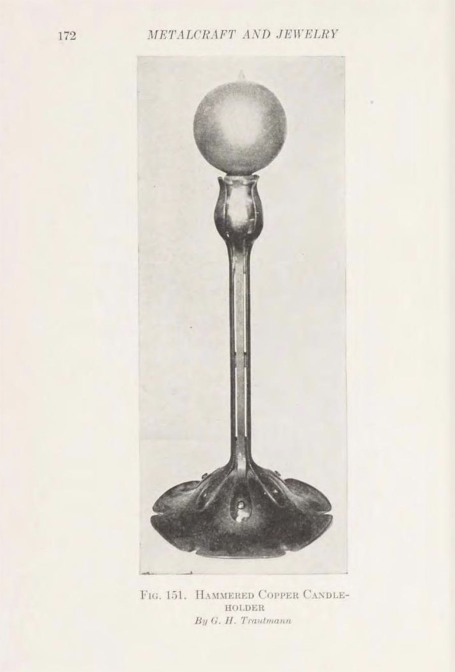 George H. Trautmann - Chicago Hammered Copper Candlestick c1910. Unsigned. Similar example pictured in Metalcraft and Jewelry , Kronquist, pg. 172, fig. 151. Excellent new patina. 11"h x 6.5"d