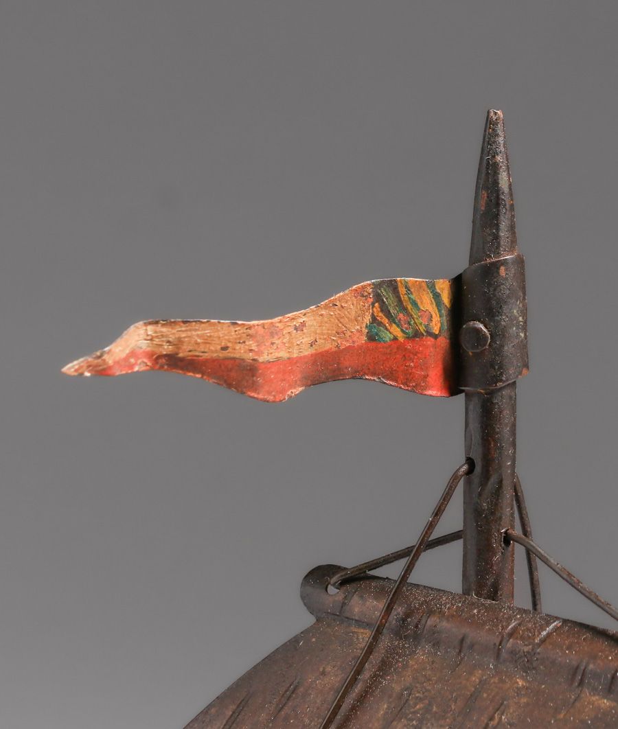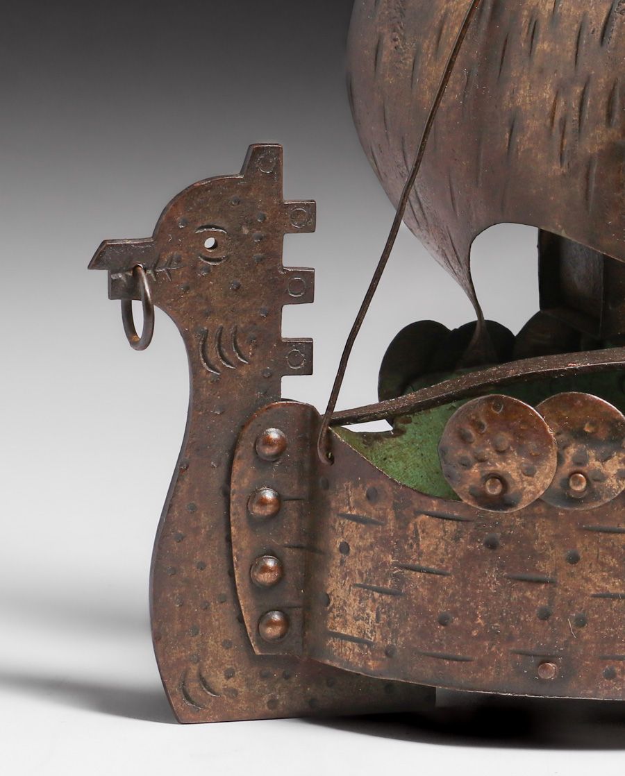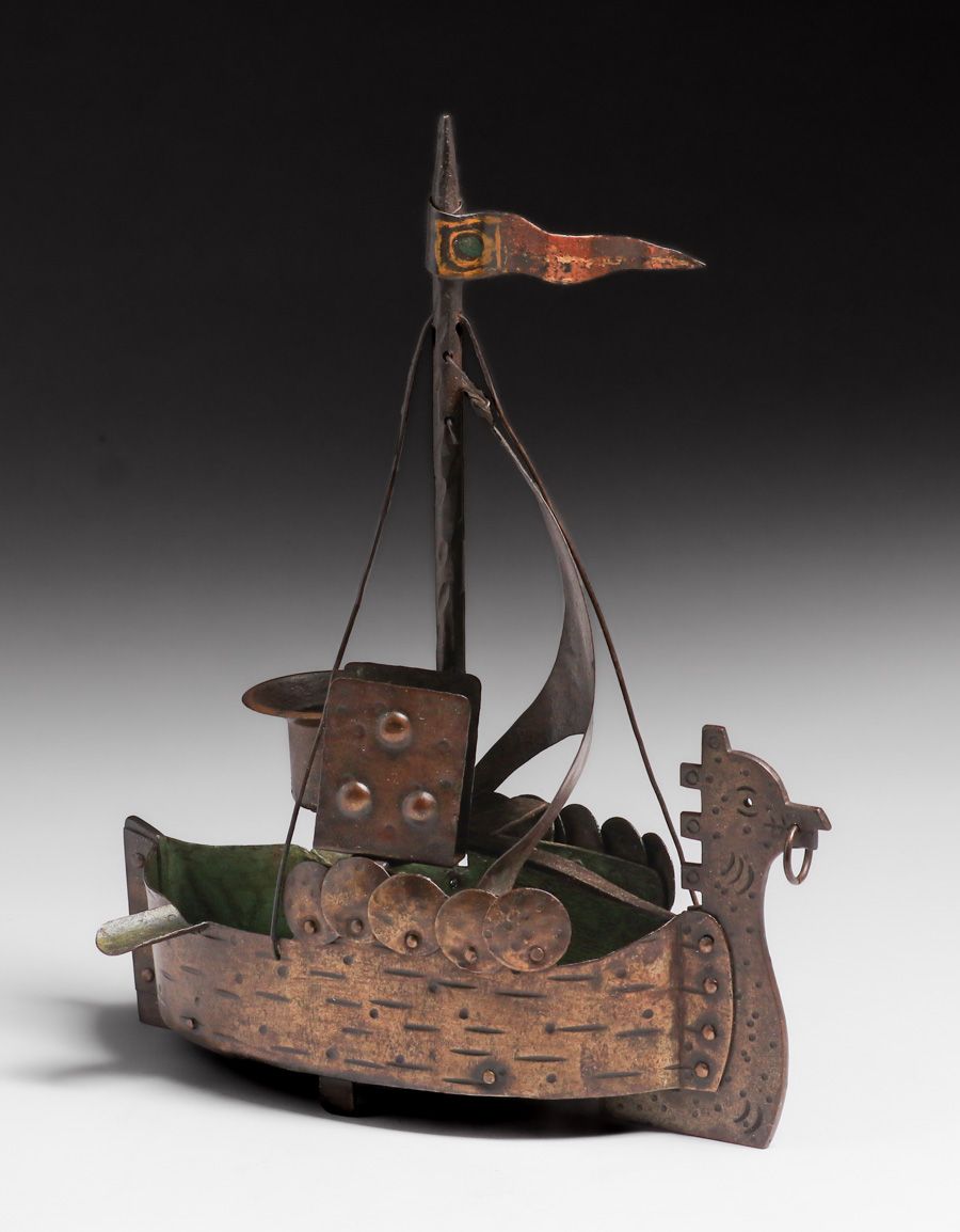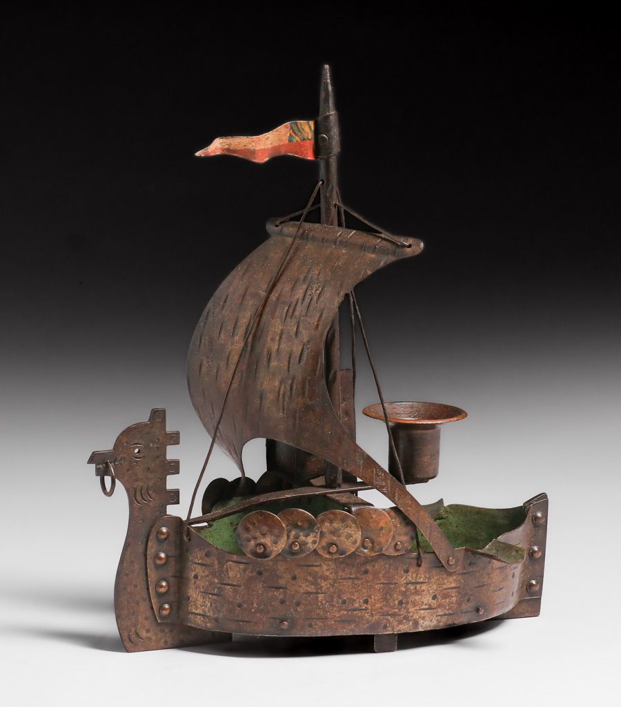 Goberg – German Hand-Forged Iron Viking Ship Candlestick c1900s. Signed only with “Made in Germany”. Excellent original patina. 11.5″h x 9.5″w x 4.5″ SOLD