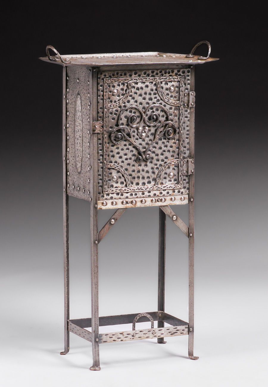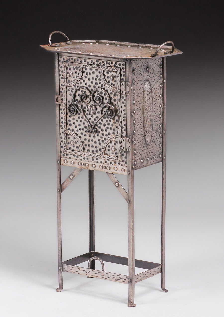 Hugo Berger - Goberg - German Silver-Plated Hand-Forged Iron Liquor Cabinet c1900s. Holds 6 bottles of wine standing. Unsigned. Excellent original patina. 18"w x 11.25"d x 33 7/8"h (32.25"h to top surface) $3800