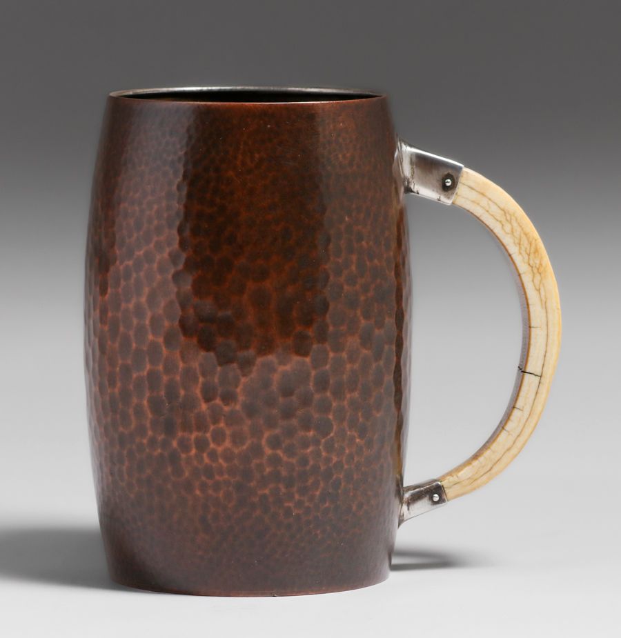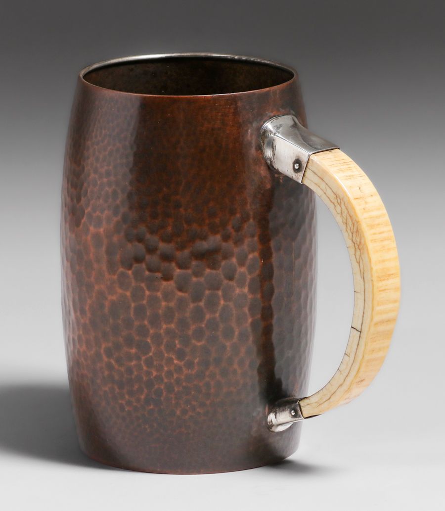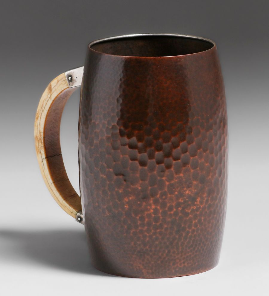 Gorham & Co Hammered Copper, Silver & Fossilized Handle Mug c1910. Signed. Ancient age cracks in handle. Excellent new patina. 6h x 5.75w x 4d inches SOLD