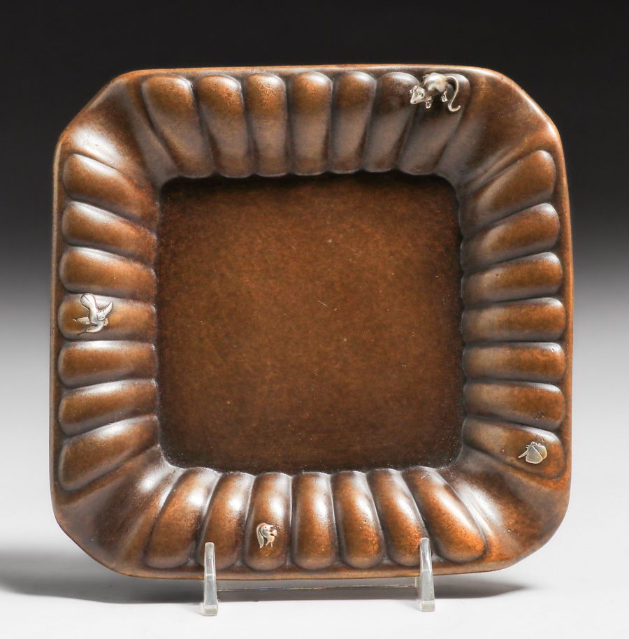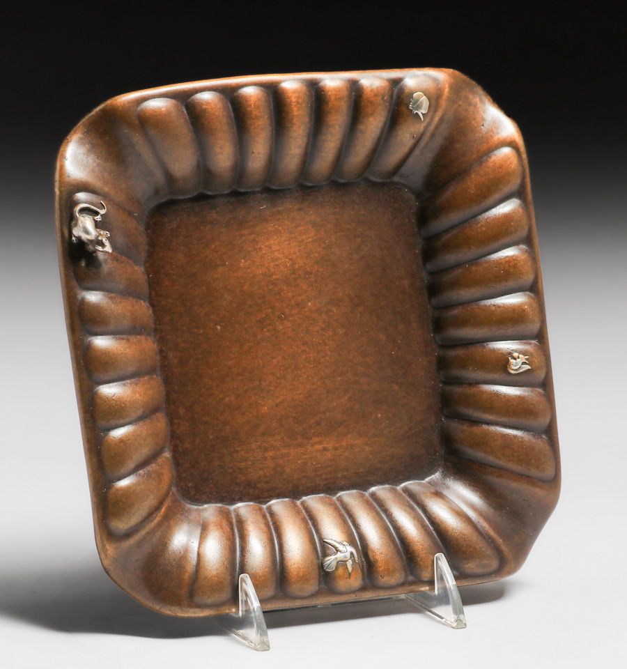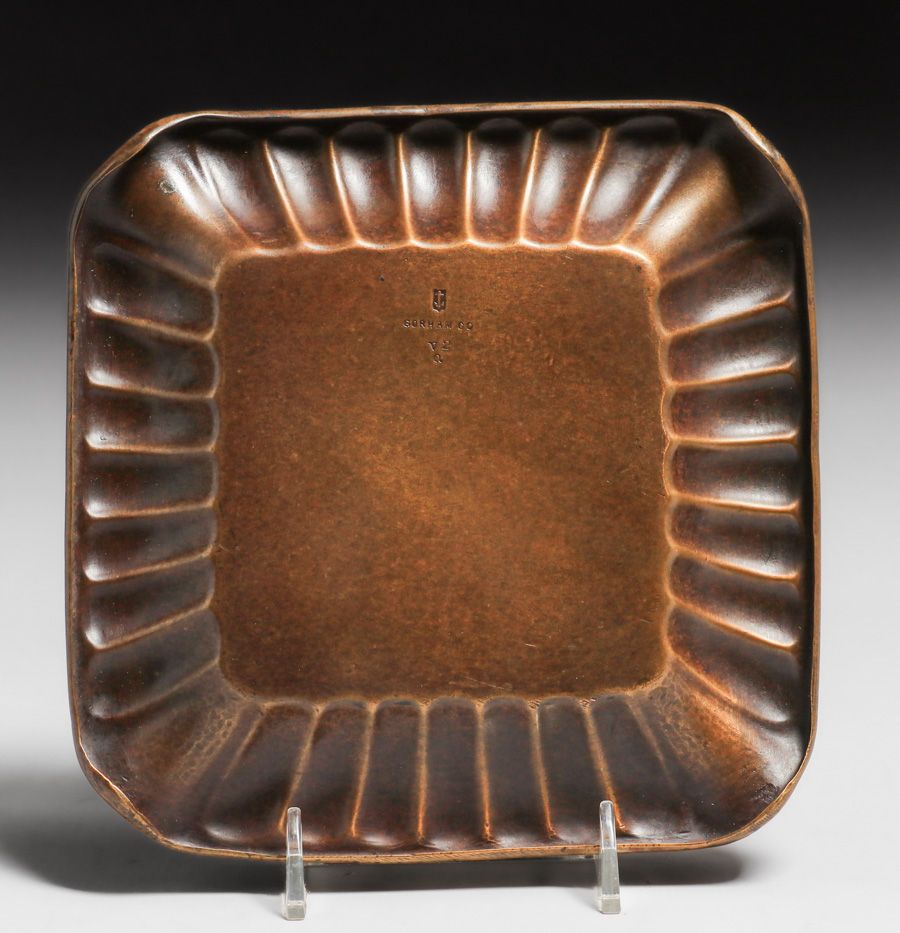 Gorham Hammered Copper & Silver Aesthetic Movement Tray c1890s. Signed. Excellent new patina. 6 3/8" x 6 3/8" SOLD