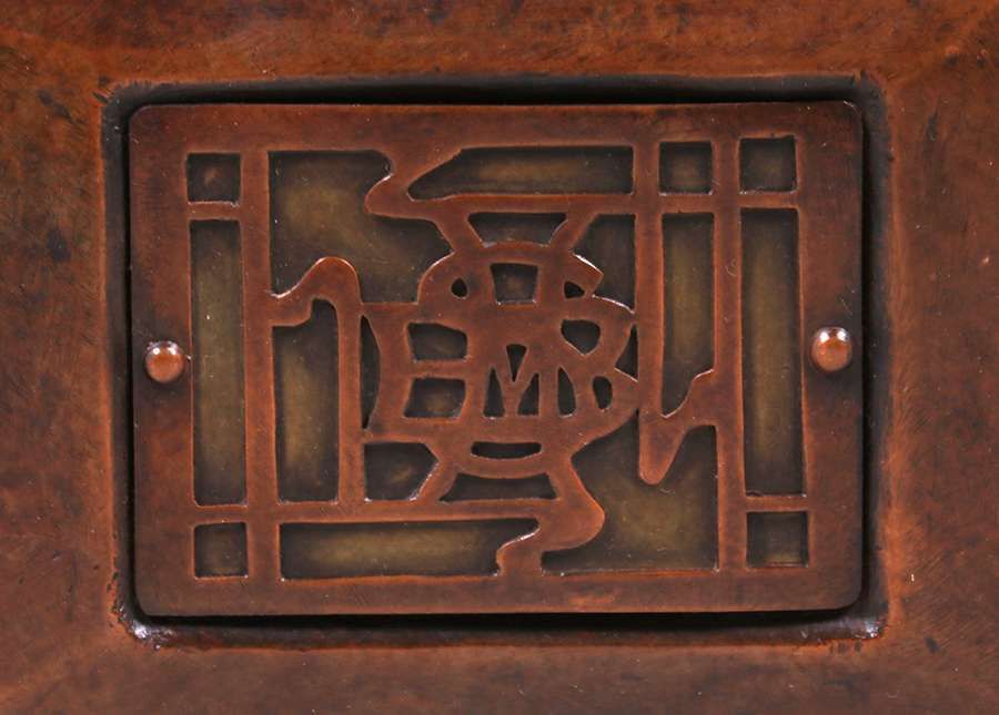Minneapolis Handicraft Guild hammered copper and brass cutout peacock box c1910. Unsigned. Excellent new patina. The double peacock motif shows Bathchelder's influence. 7.25"w x 4.25"d x 4.5"h SOLD