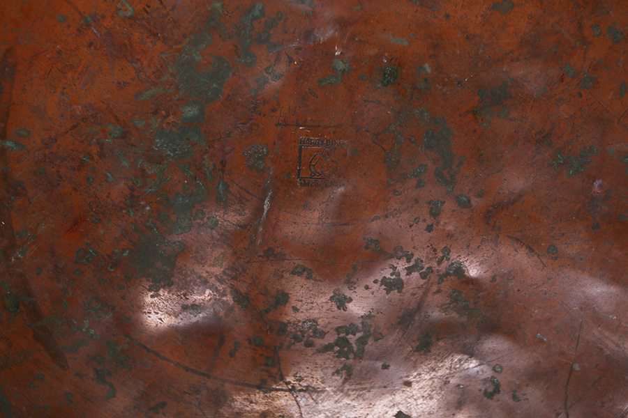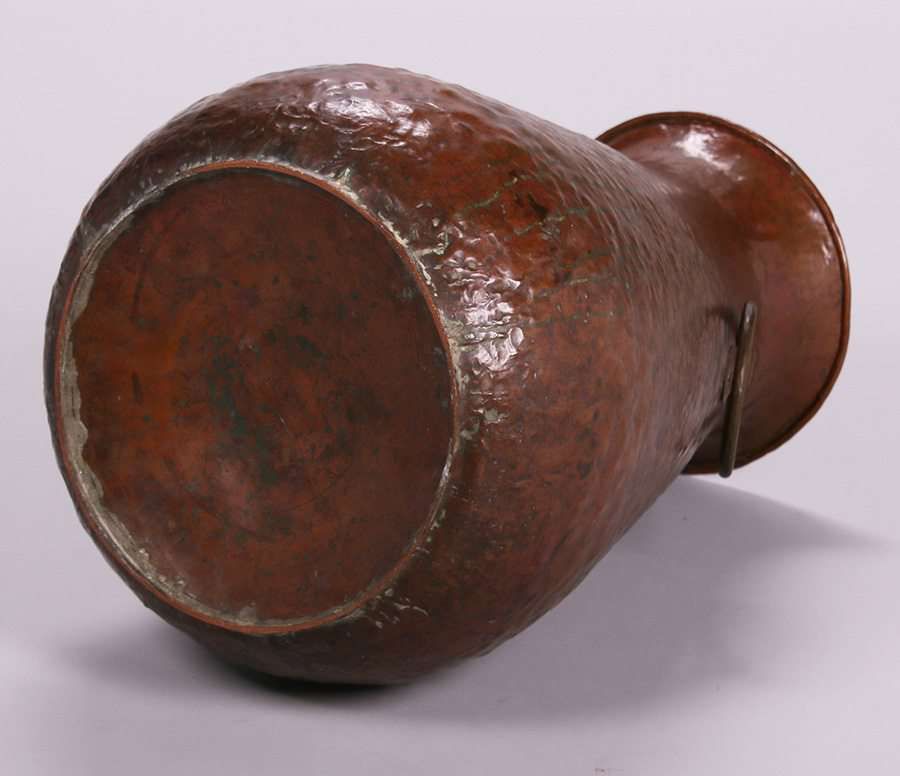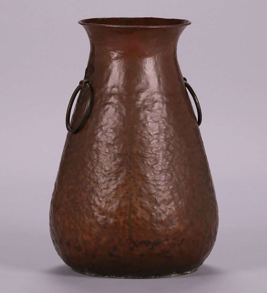 Huge Harry S. Dixon hammered copper "warty" two-handled floor vase. Excellent original red patina. Signed. 23"h x 15"d SOLD