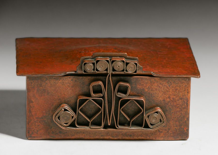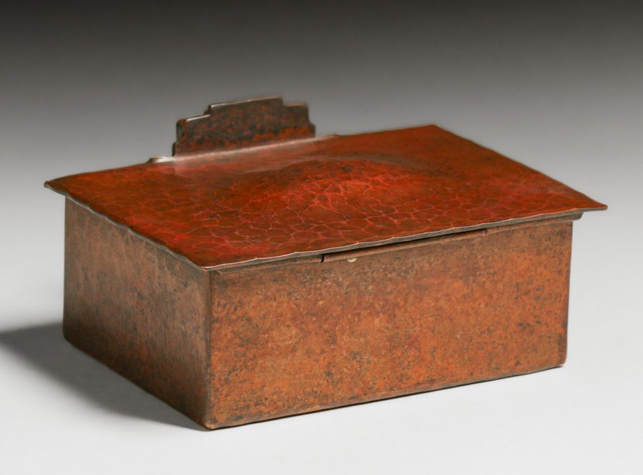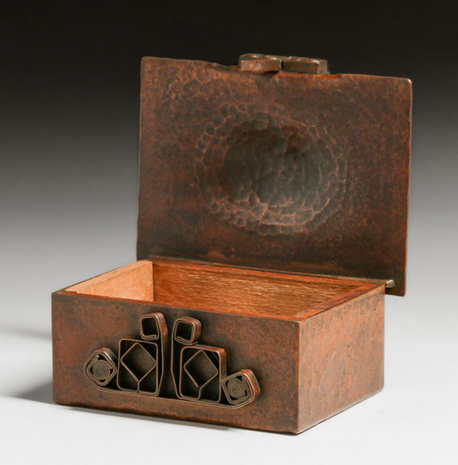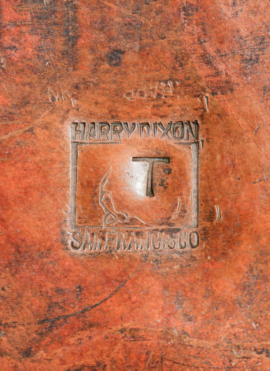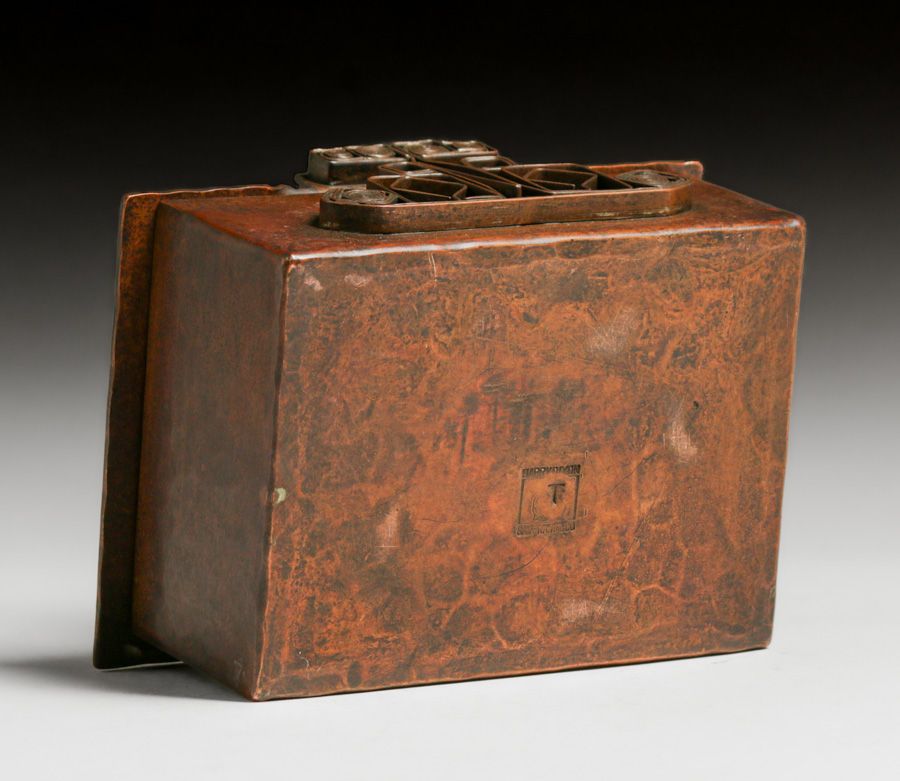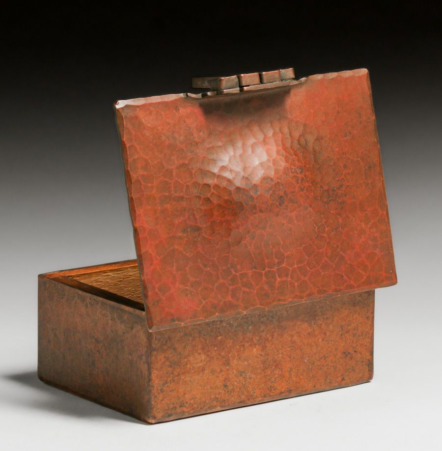 Harry St John Dixon – Byard Tully Hammered Copper Puzzle Box c1926-1932. Signed with both marks. The Tully “T” mark was occasionally added to pieces he made while working as the foreman of Harry Dixon’s shop. Color added to excellent original patina. Pictured in Bay Area Copper 1900-1950, Dirk van Erp & His Influence 2012, page 70 figures 189 & 190. 5.75″w x 4.25"d x 3"h