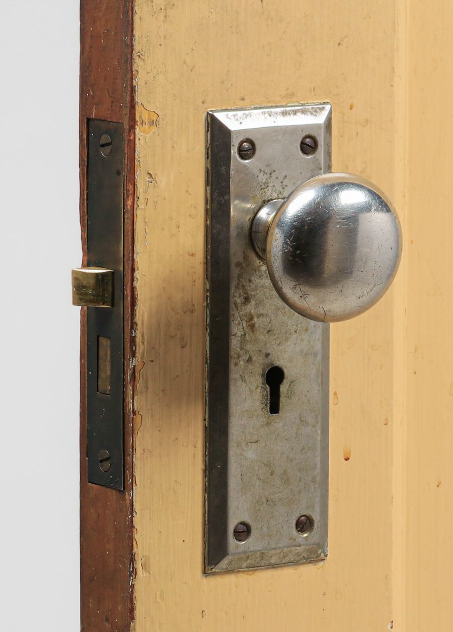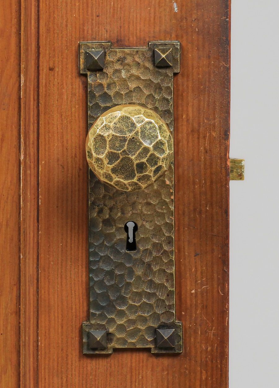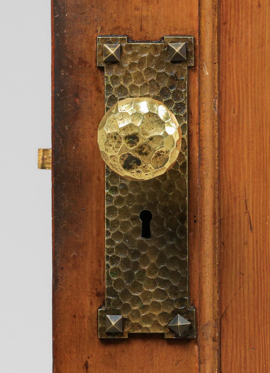 Harry St John Dixon Hammered Brass Door Knobs c1923. Set of 3 Dixon doorknobs. The back plates are stock cast backplates. Dixon hammered the three door knobs for the Phillips Frisbie Lewis Residence on Broadway Terrace in Oakland. Lewis was a student of Xavier Martinez at the California College of Arts & Crafts and Armin Hansen in Monterey. Provenance: Phillips Frisbie Lewis Residence, Oakland. Backplate 8"h x 2 5/8"w SOLD