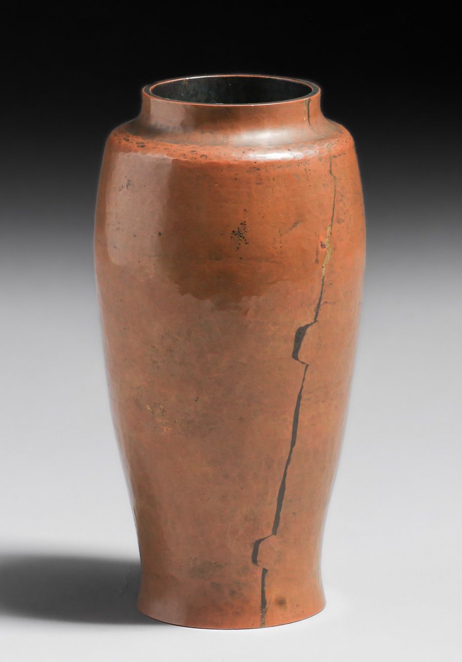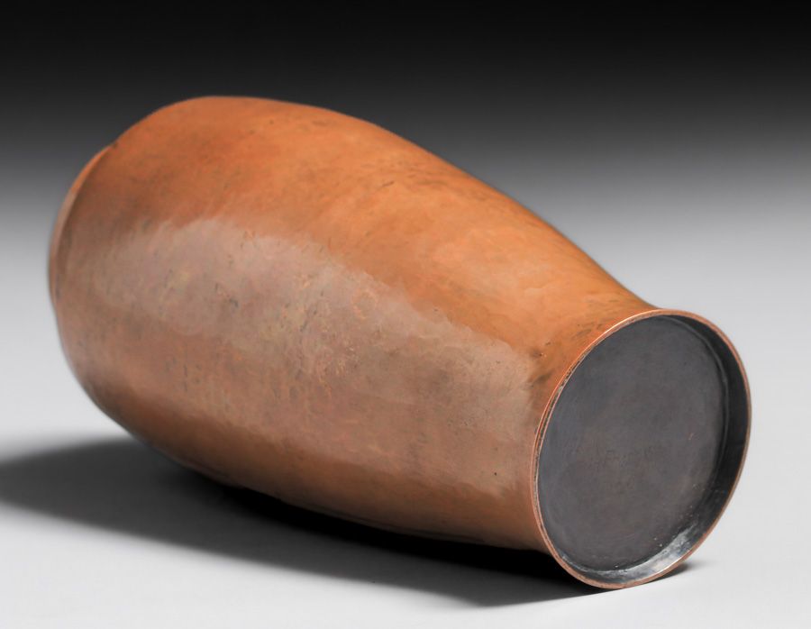 Harry St John Dixon Hammered Copper Vase 1920. Signed with the earliest example of Dixon's inscribed signature. Having been trained by Dirk van Erp and after working with Lillian Palmer for several years, Dixon opened his own shop in San Francisco in 1920. This is a great, early example of his work. Excellent original patina. 7"h x 3.25"d SOLD
