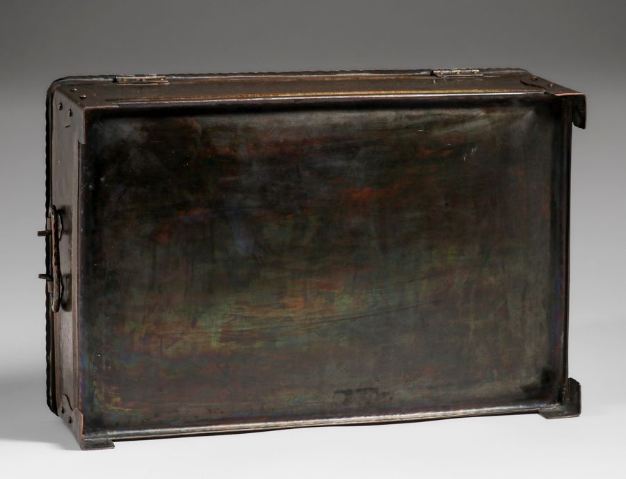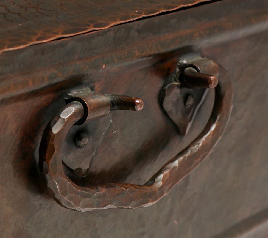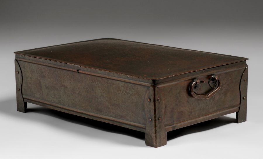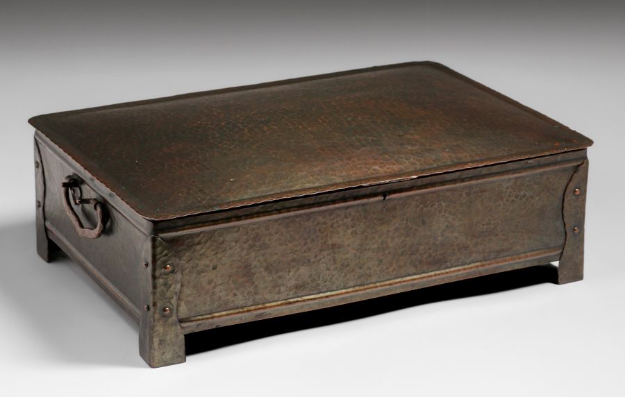 Massive Bay Area Hammered Copper Two-Handled Box c1920s. Unsigned. Likely made by someone who worked with Harry St John Dixon. Excellent original patina. 21.5w x 12.5d x 6.75h inches SOLD
