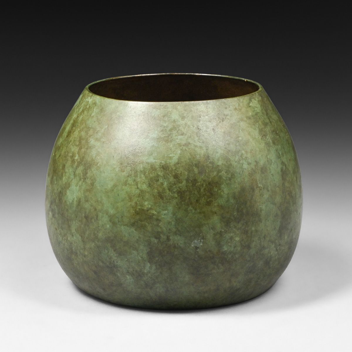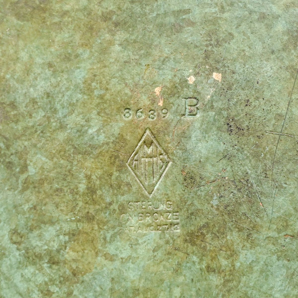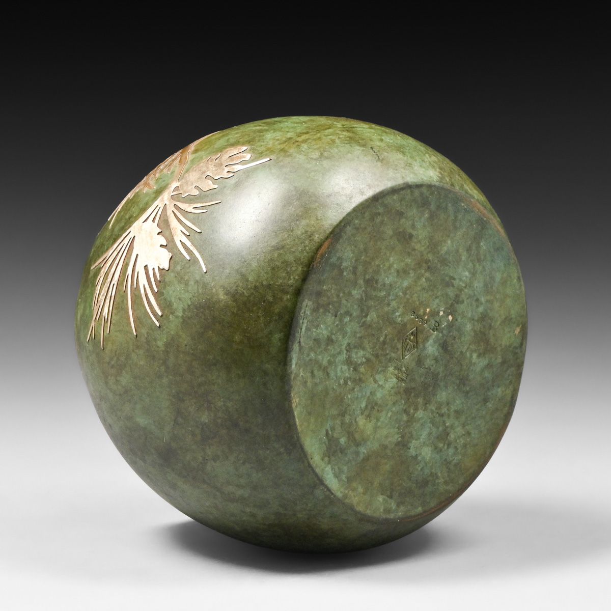 Heintz #3639 Sterling on Bronze Pine Needle Vase c1915. Signed. Excellent original green patina. 4.5"h x 5.75"d