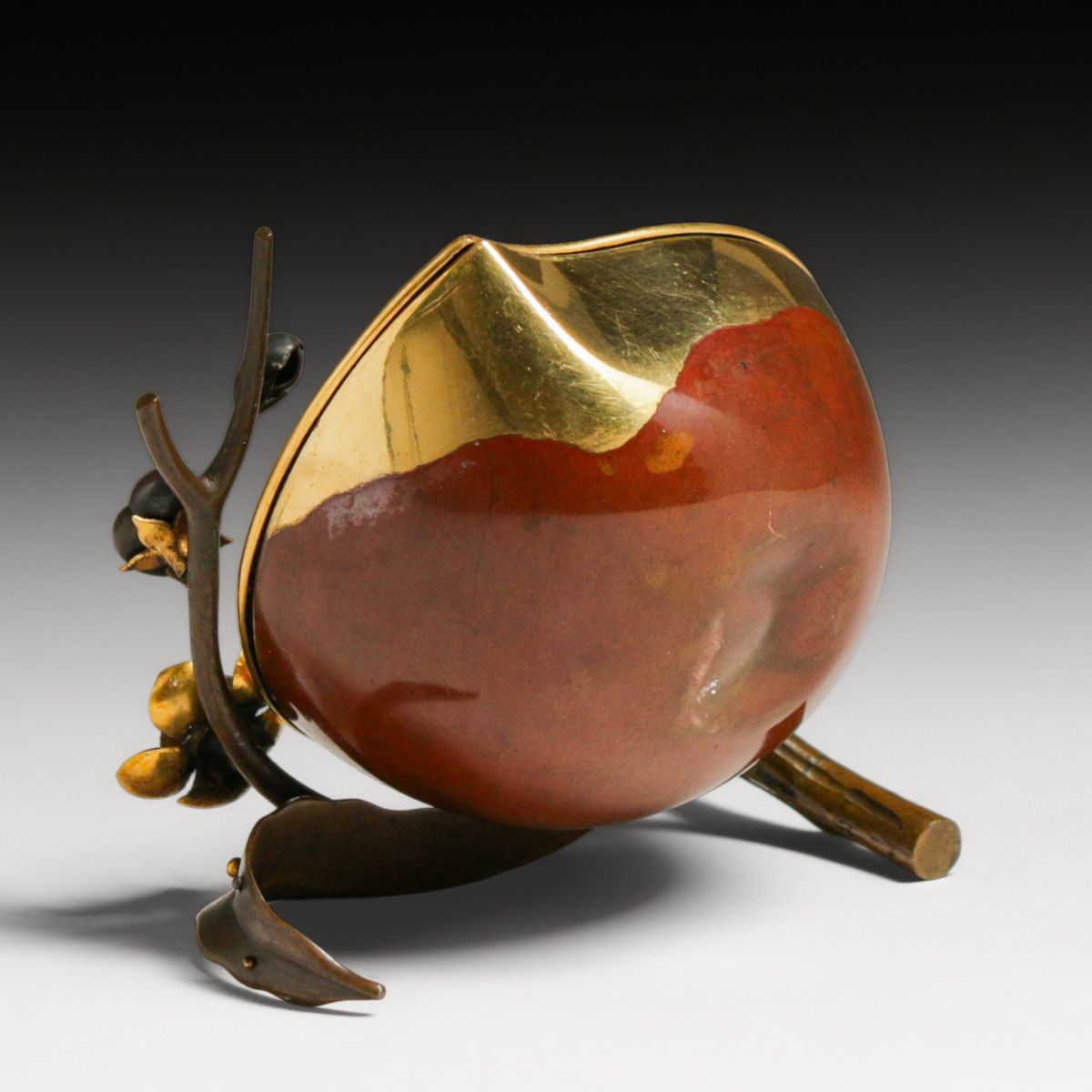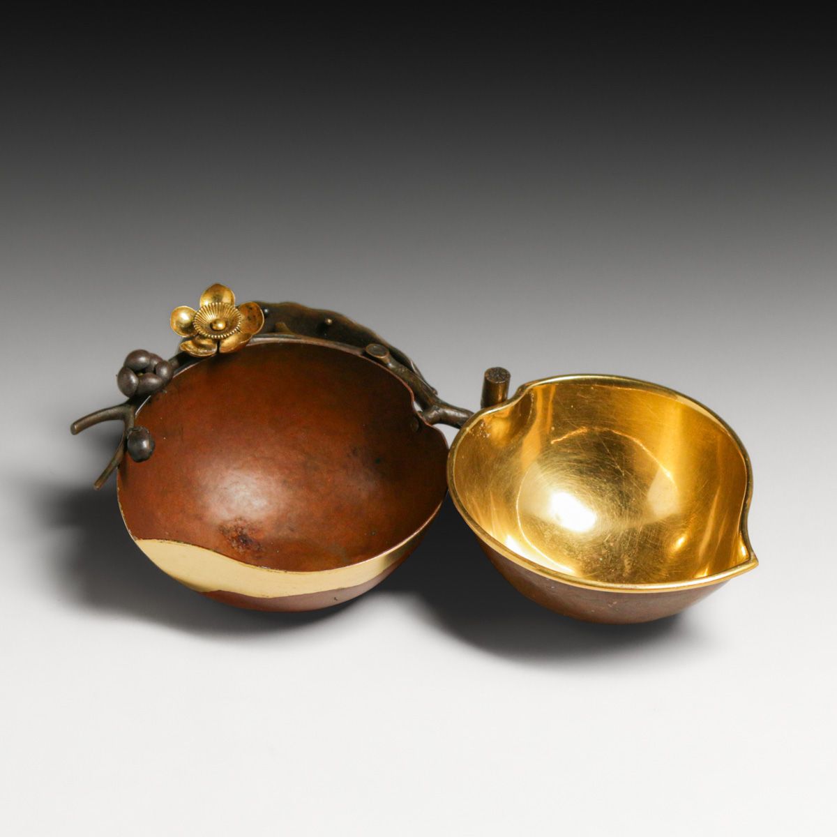 Antique Japanese Meiji Period Patinated & Gilt Bronze Bowl c1900. Peach or lotus pod form with highly detailed, dark patina exterior contrasted beautifully with a brilliant gold-leaf interior finish when opened. Adorned with delicate applied plum blossom branches symbolizing resilience and longevity, this functional art piece was likely used as a refined incense box or trinket container. Unsigned.nnExcellent original patina. 4"d x 2"h